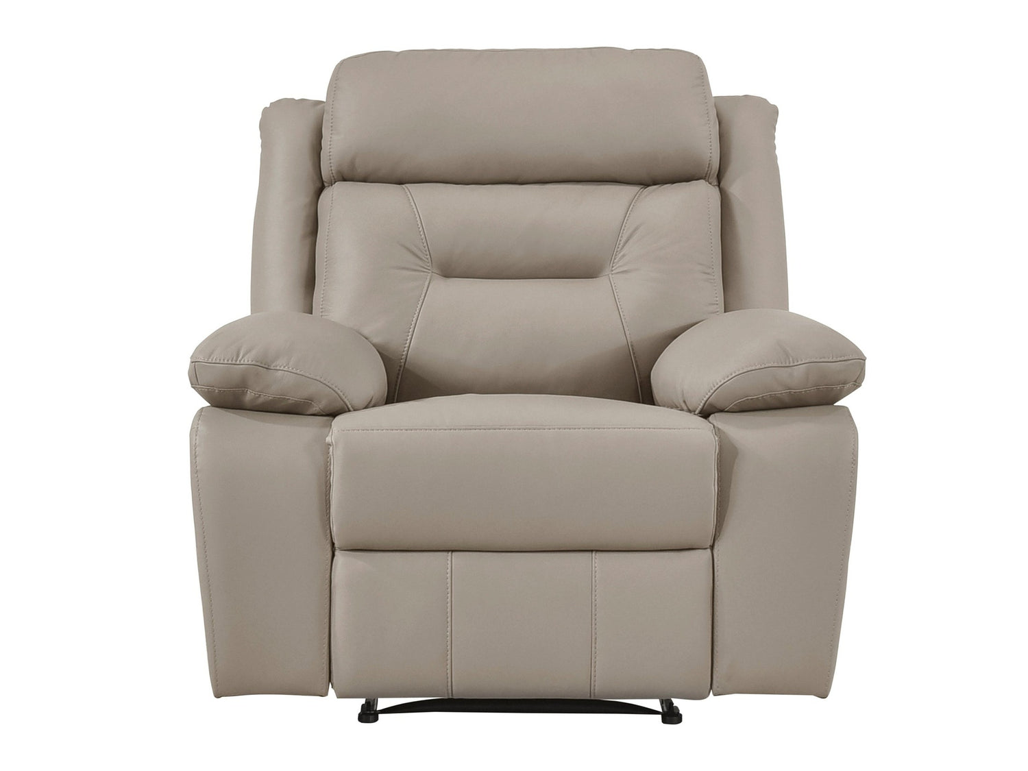 Designed with stylistic versatility and comfort in mind, the Laconia Collection’s addition to your home’s casual living room provides a comfortable gathering spot for your family and friends. The reclining chair is engaged with a pull of the side mounted tab. The transitional frame of the chair is covered in 100 percent top grain leather where the body touches, with faux leather covering the remaining areas, its latte hue complementing your home’s décor.