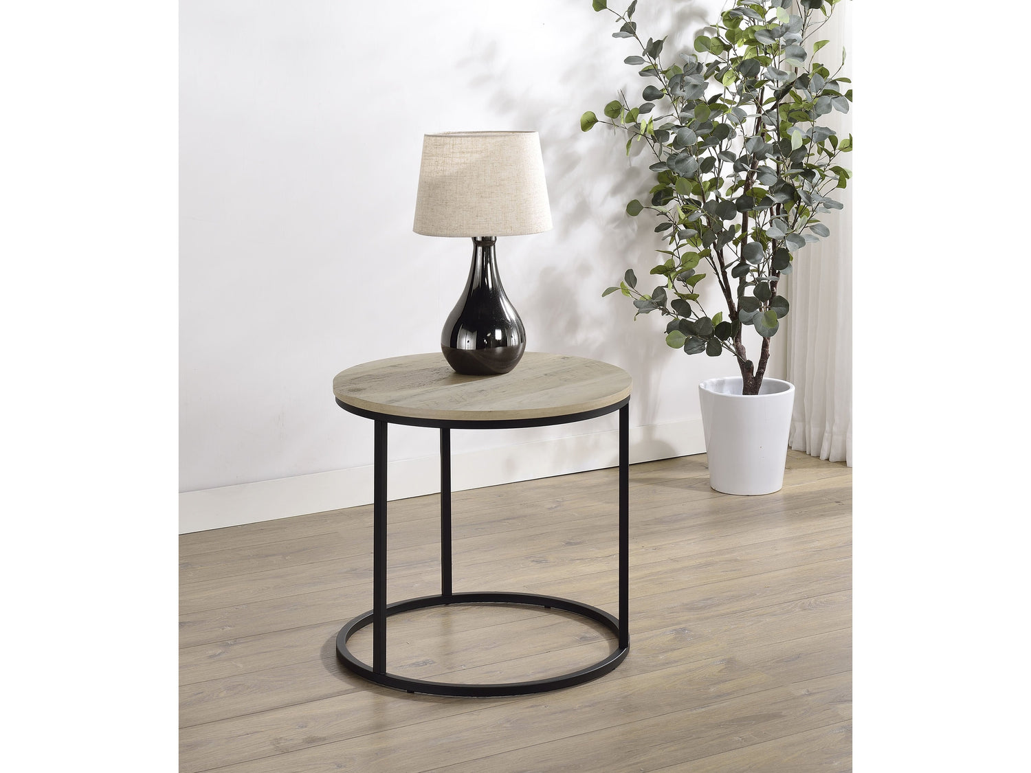 - Round end table with slim open base and rustic-inspired wood-look surface,