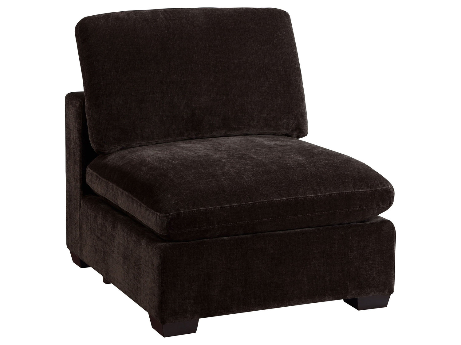 The Lakeview Dark Chocolate Armless Chair is an armless chair constructed from soft, smooth fabric that brings versatile comfort to your living space. Its sturdy wood frame ensures lasting support, making it a key component for creating a customizable sectional or providing individual seating.