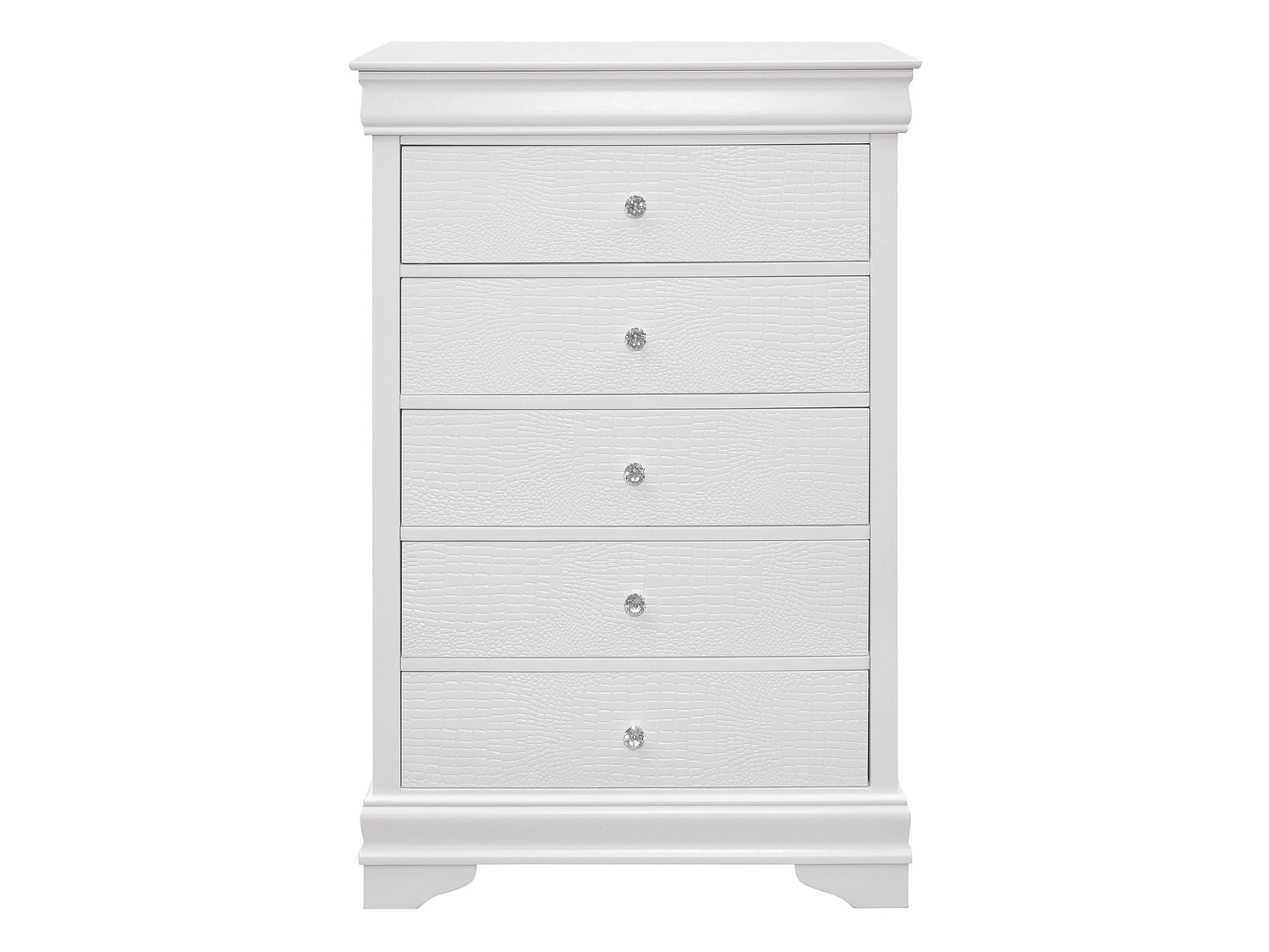 The unexpected intersection of traditional design and glamorous styling creates the dynamic look of the Lana Collection. A white finish is utilized to enhance the faux alligator embossed drawer fronts of the chest with crystal faceted knob hardware lending an additional fabulous touch. The chest features hidden storage allowing for the discrete placement of your personal affects.