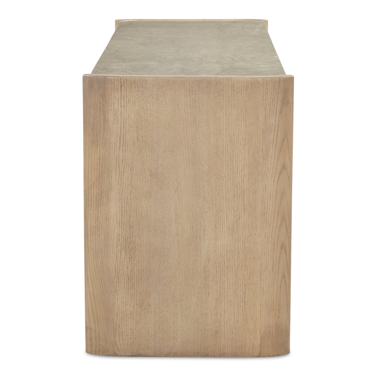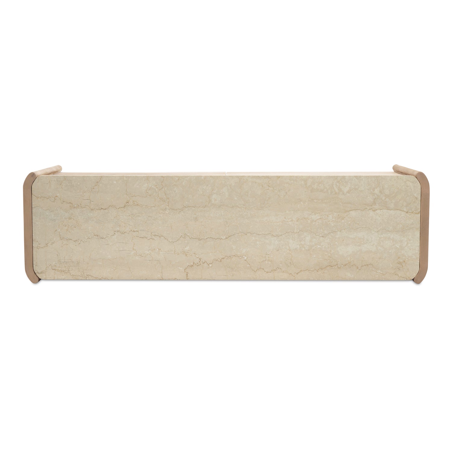 - Thick, solid wood curved elements underscore overhanging rounded marble top