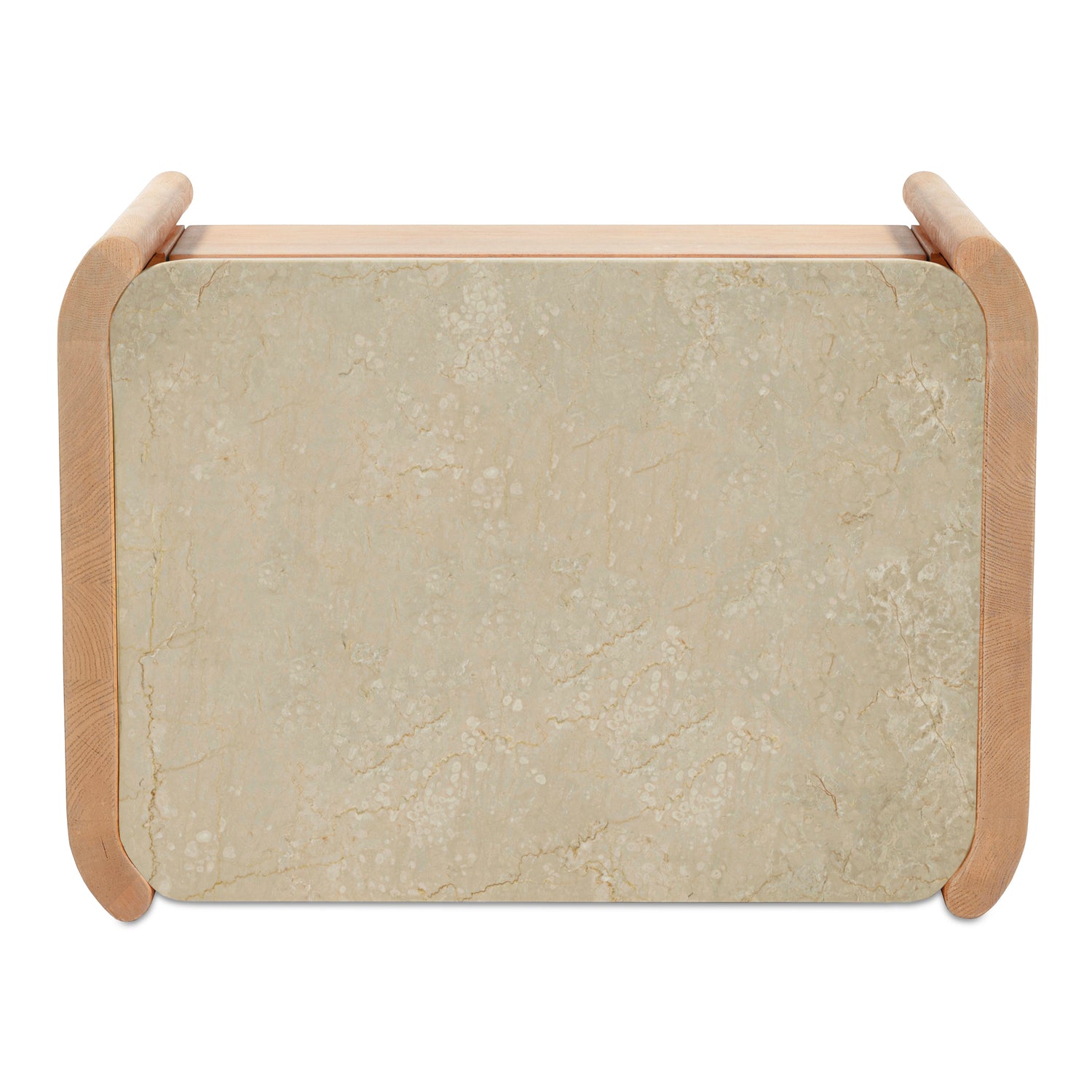 - Thick, solid wood curved elements underscore overhanging rounded marble top