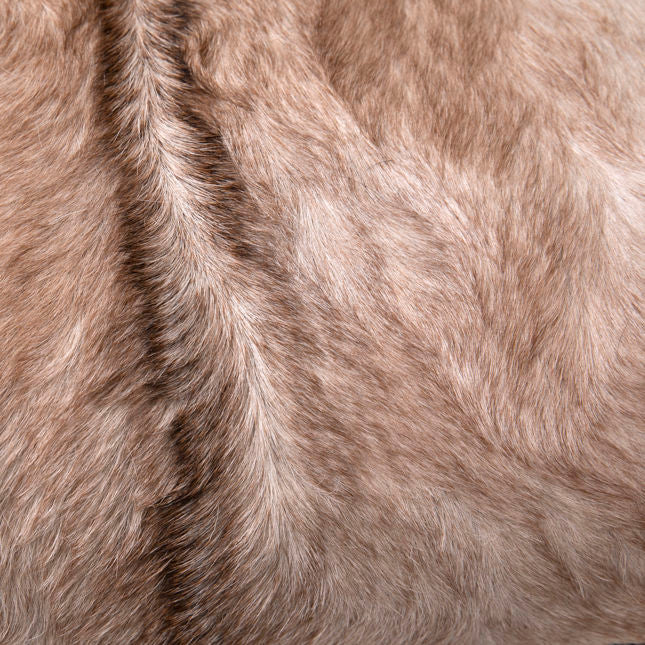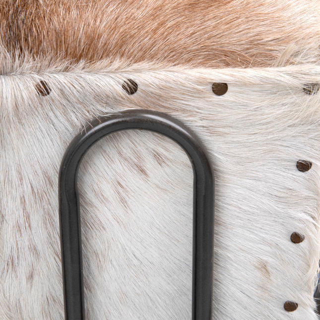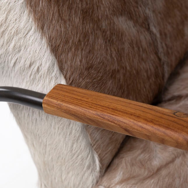 The Laney Occasional Chair features genuine goat hide with a natural brown and white pattern, set against a sleek black iron frame and complemented by warm teakwood armrests. This chair's unique blend of materials and finishes creates a stylish and contemporary look, making it a striking addition to any modern or eclectic space.