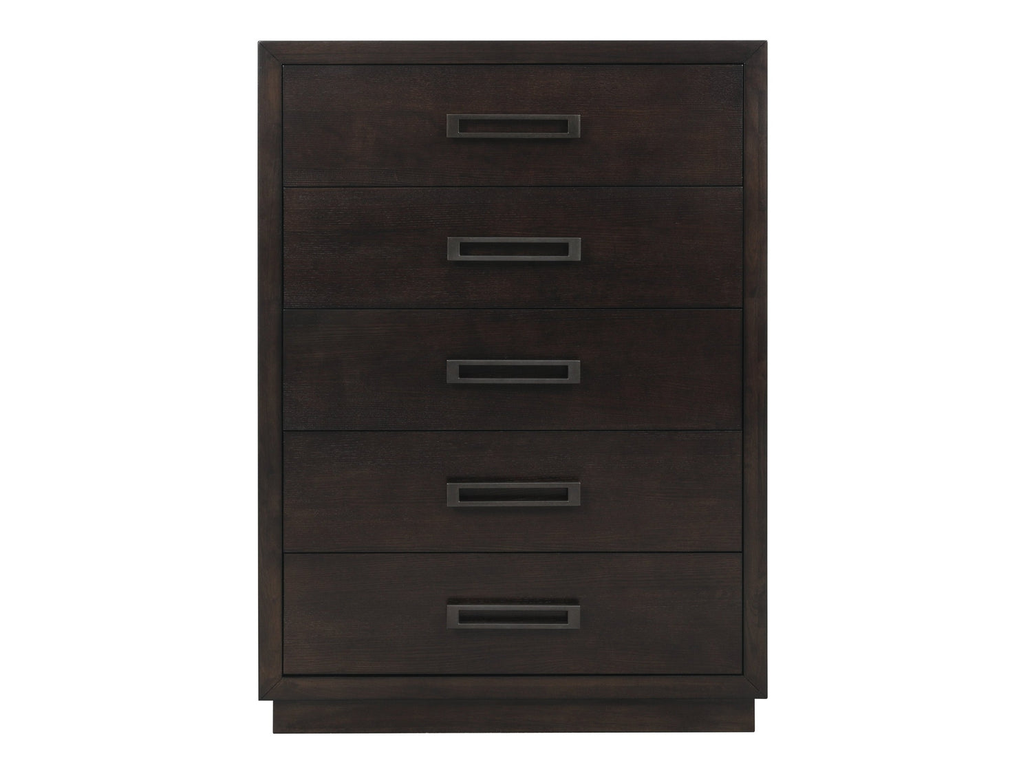 The striking profile of the Larchmont Collection is an intersection of texture, material and style. Prominent horizontal metal hardware is mounted on each drawer front, and is finished to complement the tone of the charcoal finish over ash veneer.