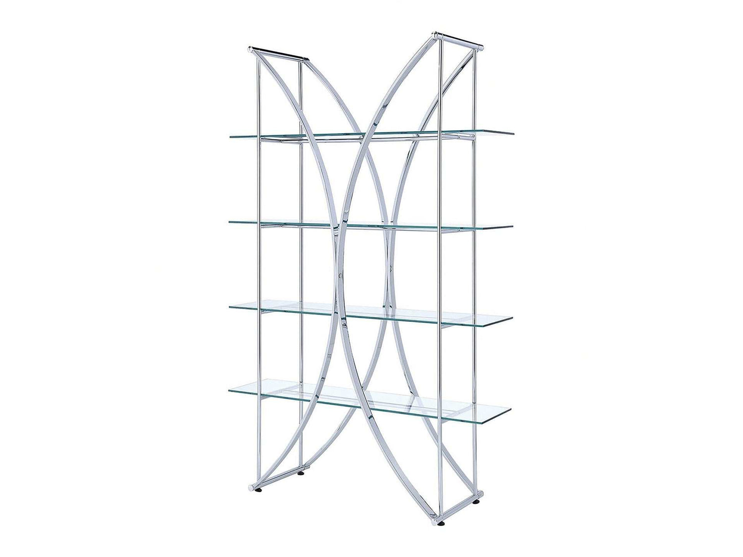 The ultimate in contemporary design rests in this eye-catching bookcase. Modern architecture meets art in a compelling silhouette blending arc-shaped and linear steel frames with clear tempered glass shelves. Four tiers offer ample space for displaying books, decor, and potted greenery. A fresh chrome finish adds luster to a tastefully designed contemporary space. Energize a modern room with a subtle yet tasteful bookcase.