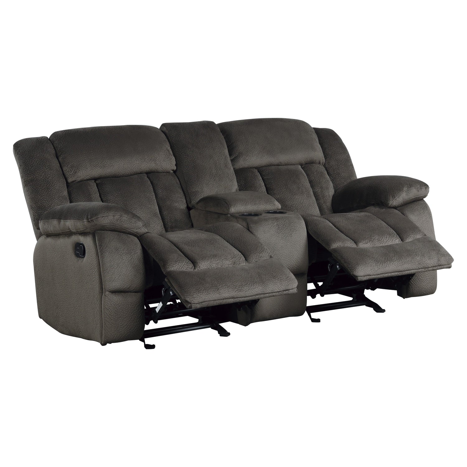 Generous seating combined with functional touches makes the Laurelton love seat the perfect addition to your living room. The double glider reclining love seat’s center console features dual cup holders and hidden storage. Chocolate textured plush microfiber fabric is available as cover options for this amply appointed love seat.