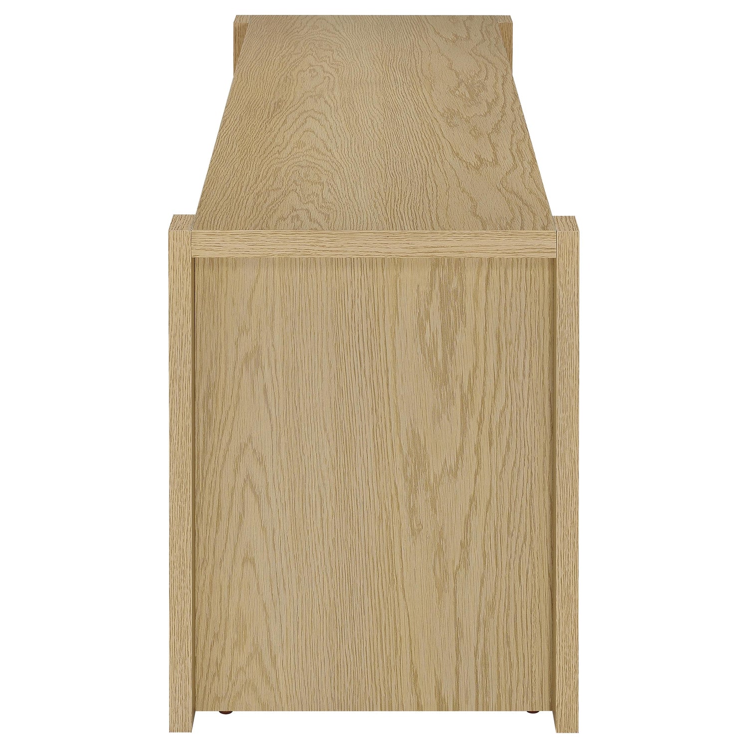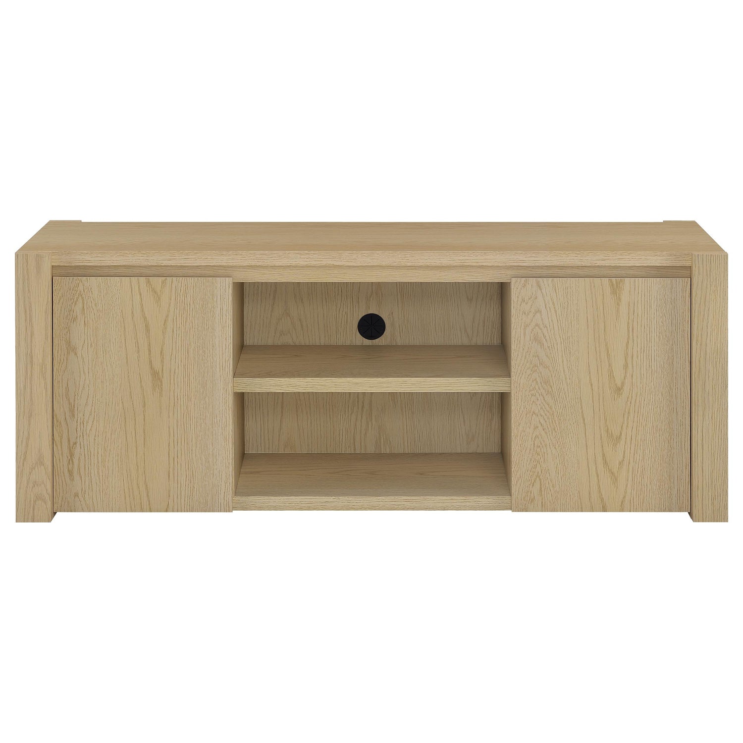 - TV stand with open shelving and two hidden compartments in a light oak woodgrain finish,