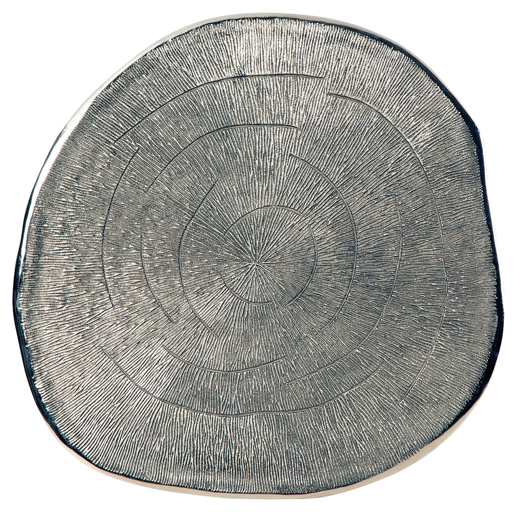 Rich with curated character, this end table puts a contemporary spin on natural beauty. Its irregularly grooved top is refined with the glamour of a gleaming chrome-tone finish. A black base completes this cool piece.