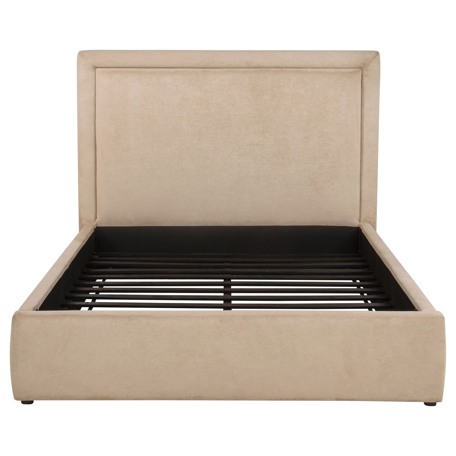 - Eastern king bed with clean panel headboard and fully upholstered low-profile frame,