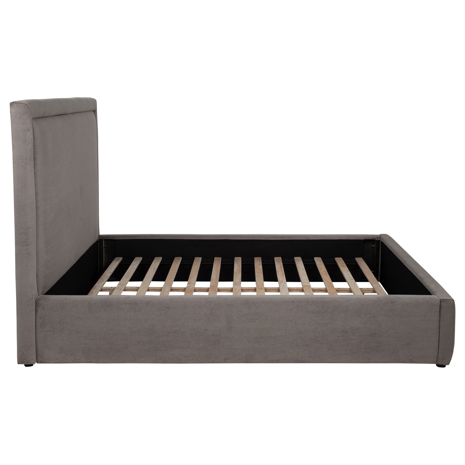 - Queen bed with clean panel headboard and fully upholstered low-profile frame,