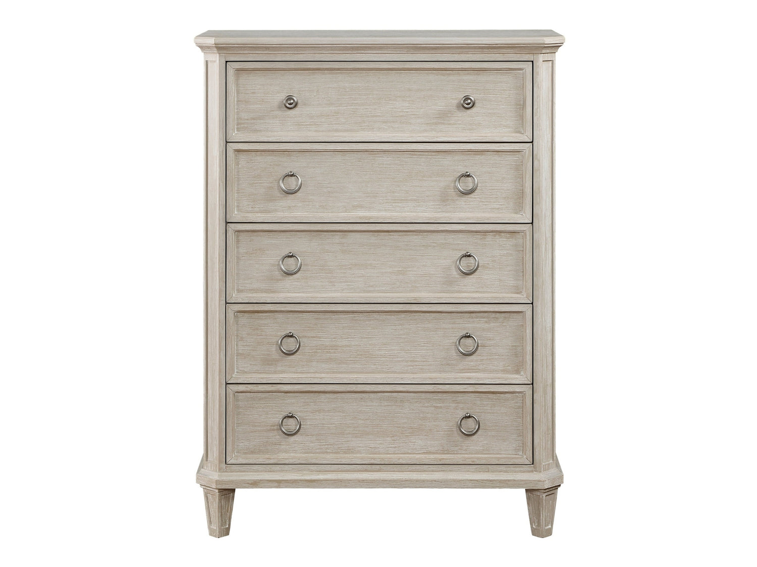 In a modern look on traditional design, the Leander Collection combines refined lines with classic accenting to create an elegant statement for your bedroom. Clipped corners define the profile of the chest while picture frame molding lends detail to the fronts of each drawer, and pilasters. Weathered nickel ring pull hardware centers the drawers with the chest also featuring knob hardware on the top drawer. The oak veneer of the collection is finished in light brown.