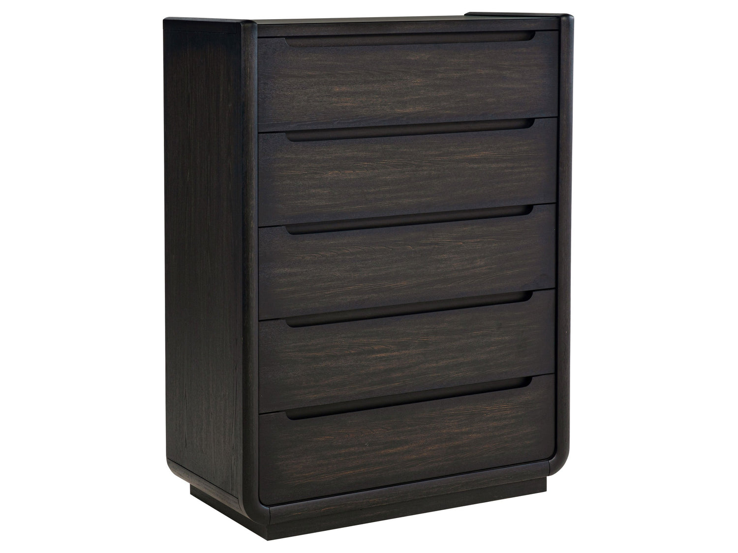 - Five-drawer chest in burnished black with rounded edges and sculpted minimal lines,