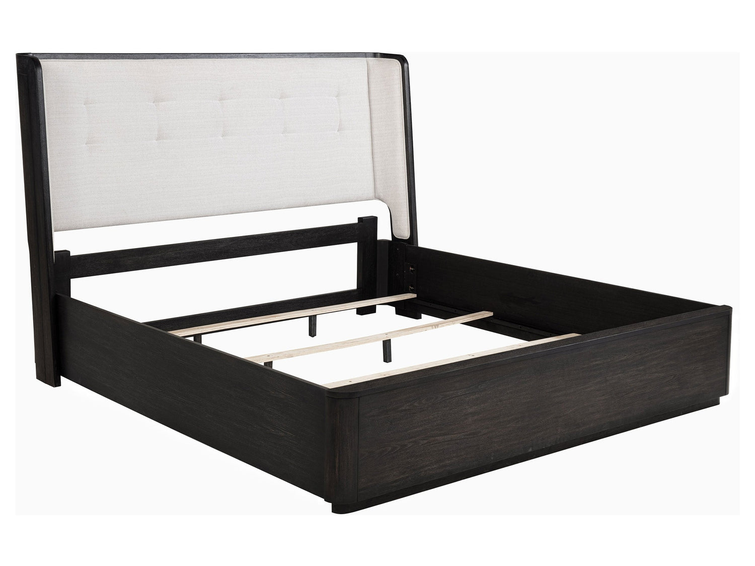 - Queen wingback bed with soft curves and burnished black frame for modern sculptural style,
