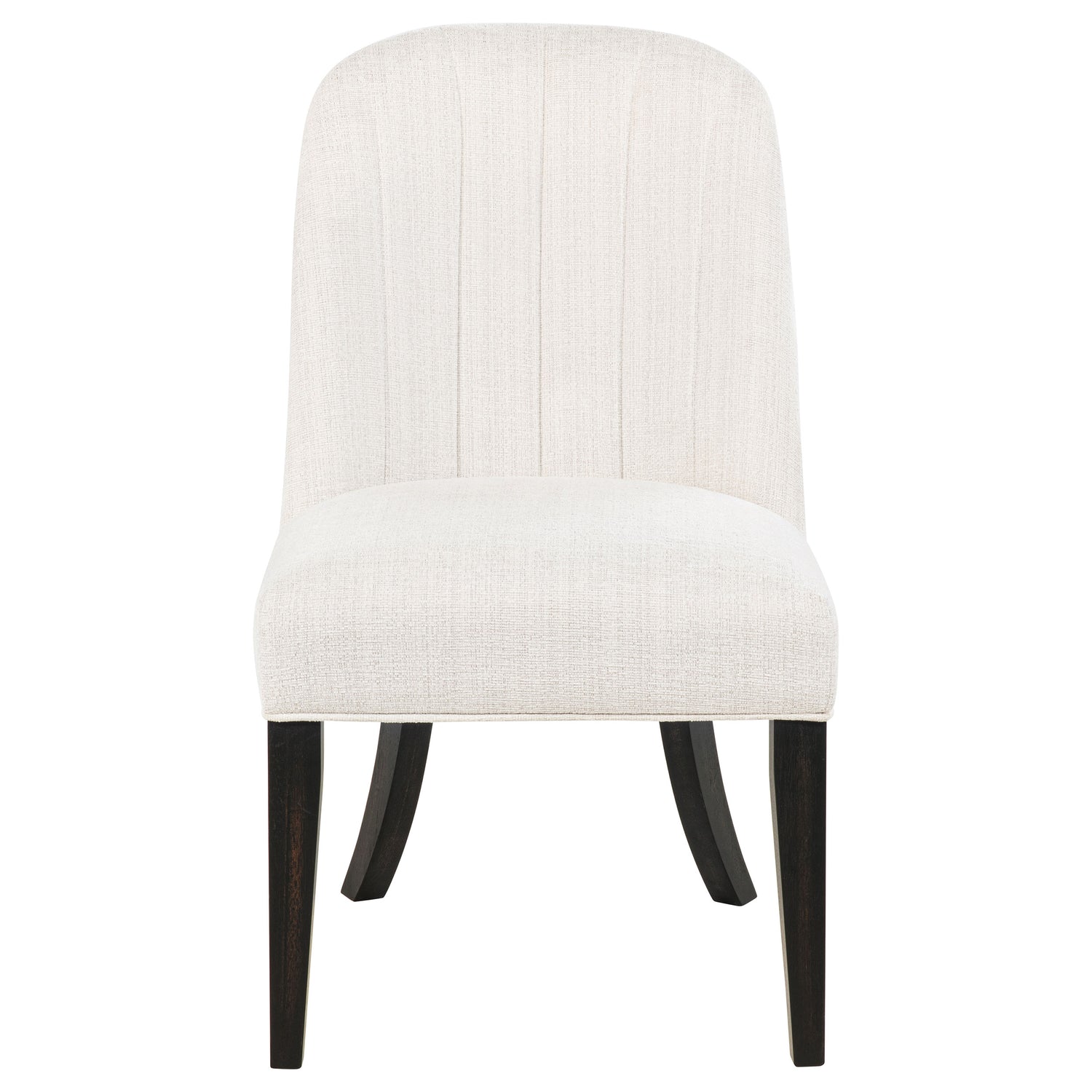 - Dining side chair wrapped in cream fabric with subtle channel tufting along the back,