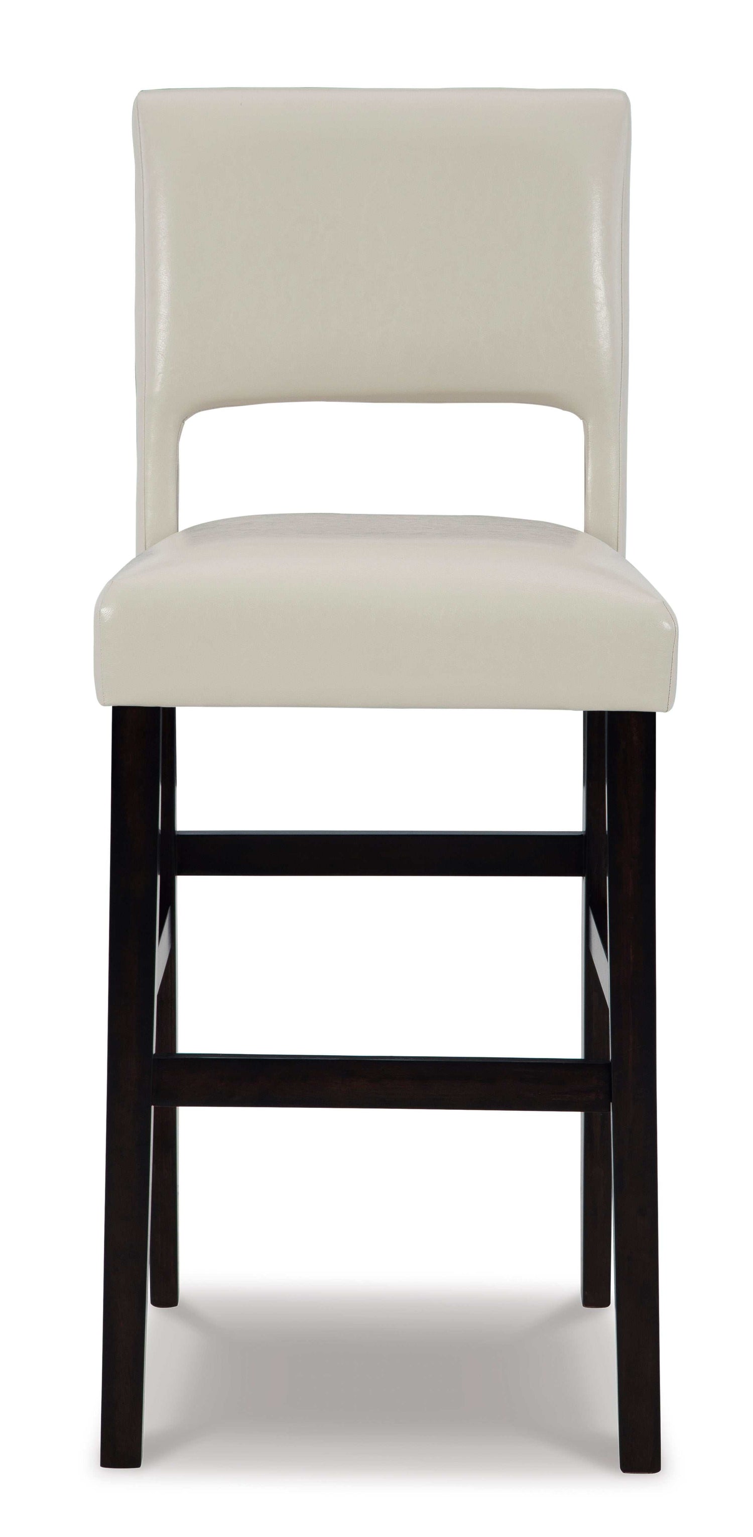 Contemporary design pairs with comfort in this upholstered bar stool. Its dark brown wood-tone frame and cut-out back provide a cool complement to neutral-toned faux leather upholstery. The bar stool's cushioned seat ensures that long, lingering meals are enjoyed in comfort.