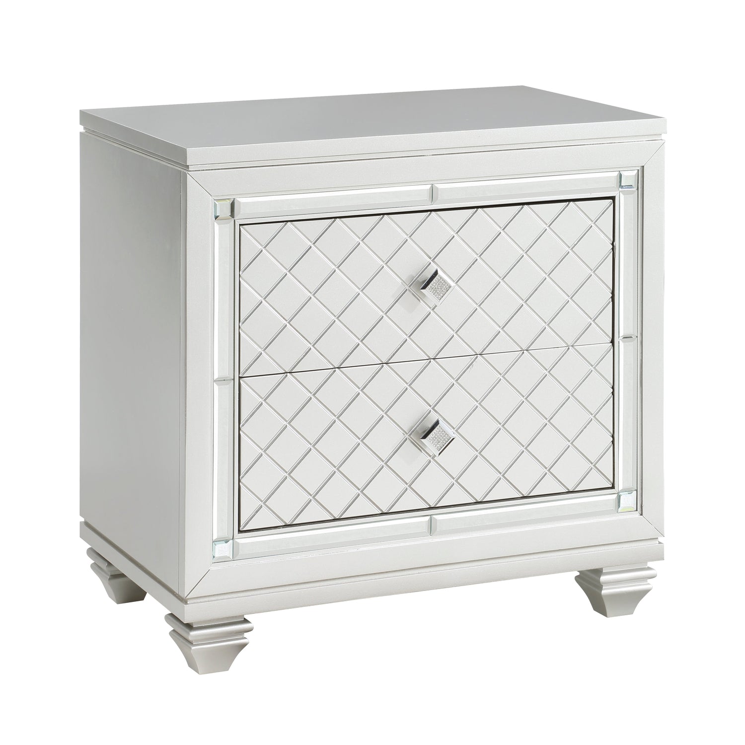 The bold visual presentation of the Leesa Collection complements your glamorous design aspirations. Diamond pattern drawer fronts and hardware, and mirrored framing are featured on the silver-finished nightstand, it’s classic styling lending timeless accent to the look of the collection.