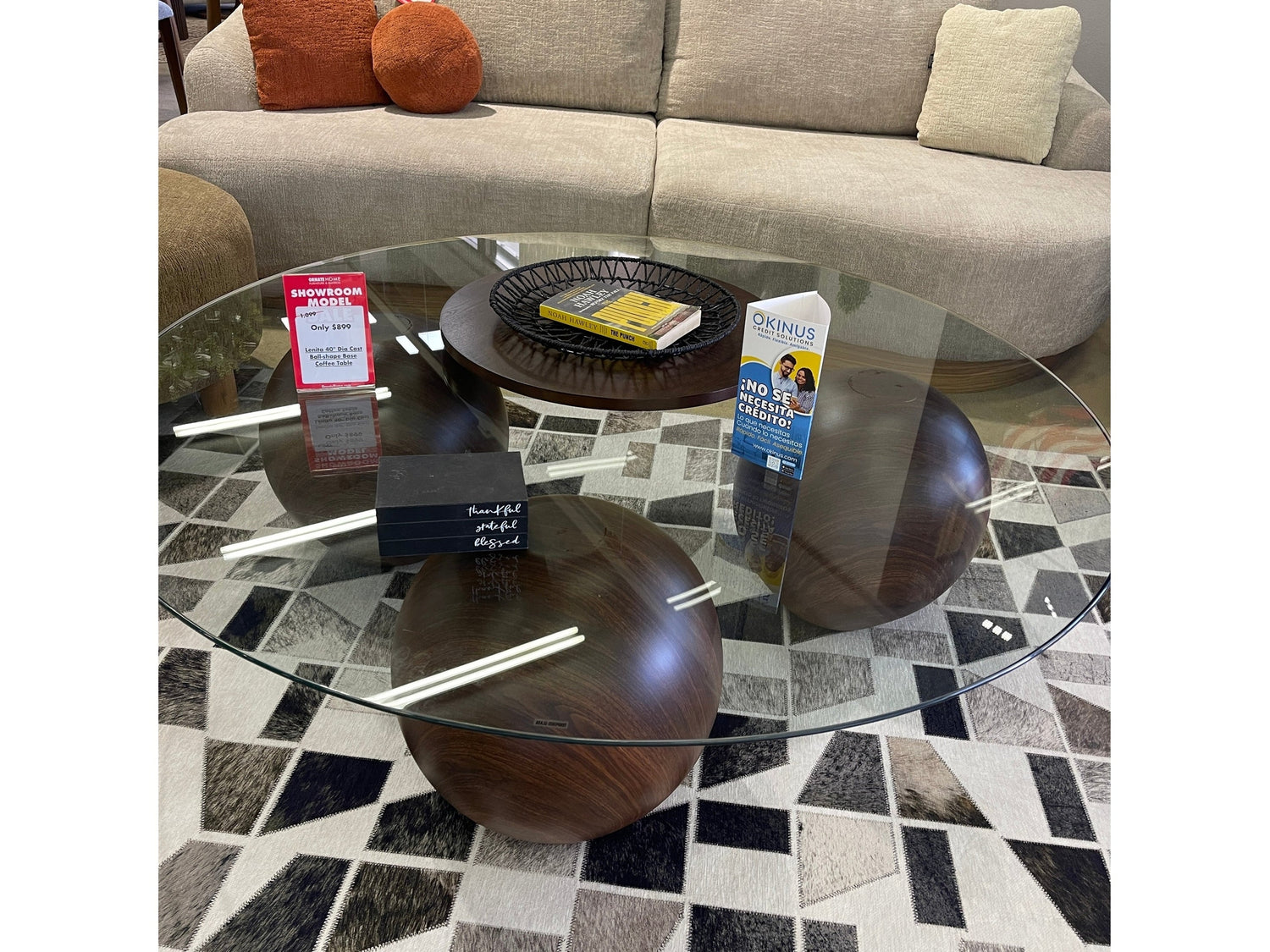Abstract 16" Dia Dark Walnut Cast Ball-Shape Base Coffee Table w/ Round Clear Glass Top