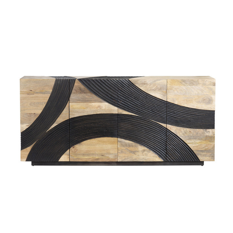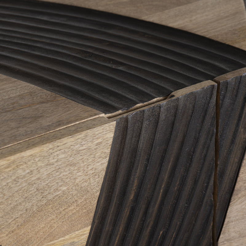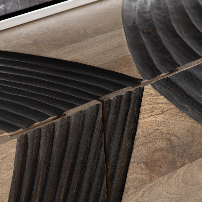 - Features a bold, curved black-stained pattern over a natural mango wood grain finish, creating a striking visual contrast