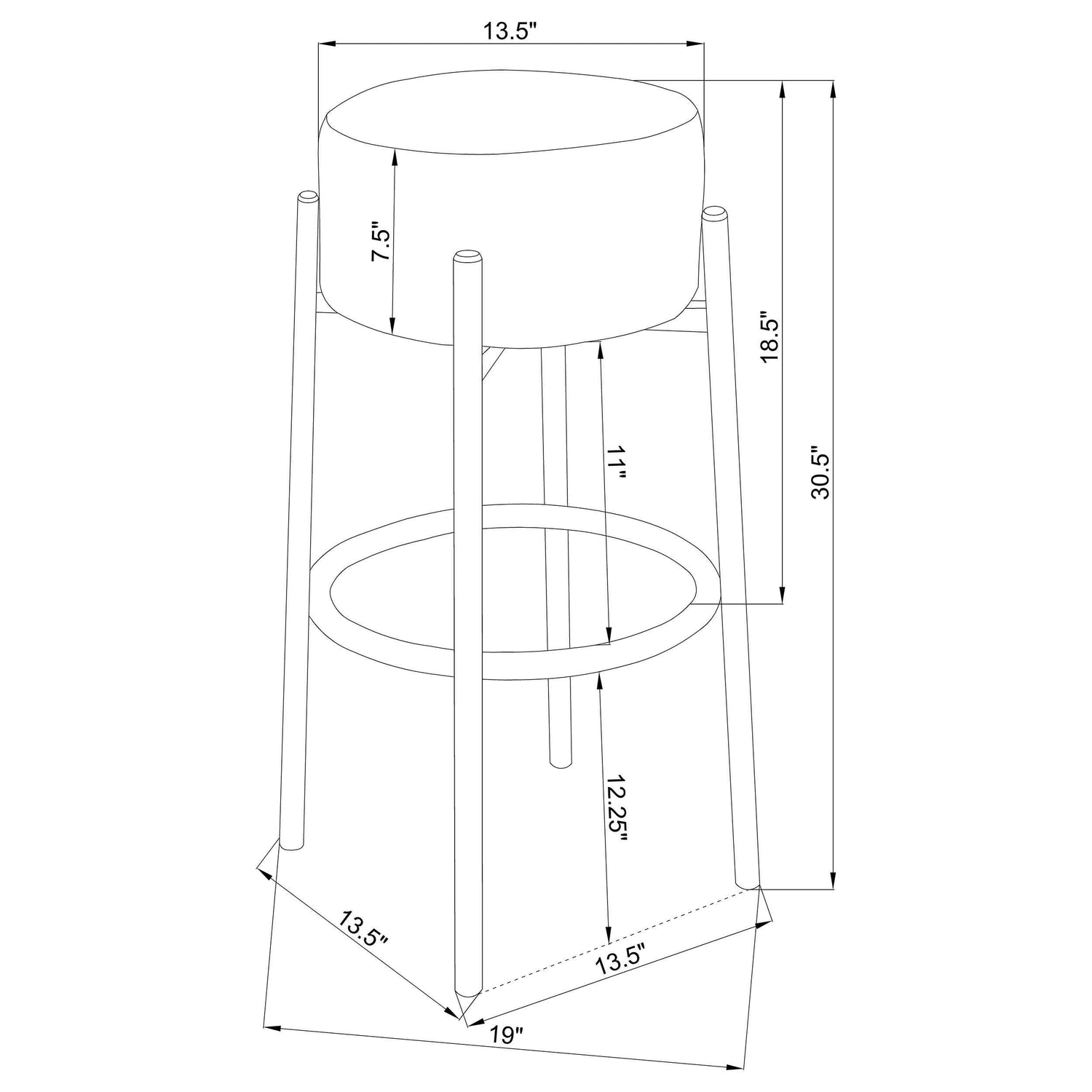 Casual with sleek lines, slide this pair of contemporary stools up to a bar or kitchen breakfast area. Designed with a thick pouf-like cushion wrapped in a white upholstery, this stool lends an elegant playful charm to any space. The pouf-inspired seat rests nestled between an extension of the minimal style, sleek modern frame. Presenting a stark contrast in color, each two-tone stool presents a white seat cushion held by a black finish frame. Four slim side supports lift the round cushion, offering rest and relaxation with a matching round brace that acts as a footrest.