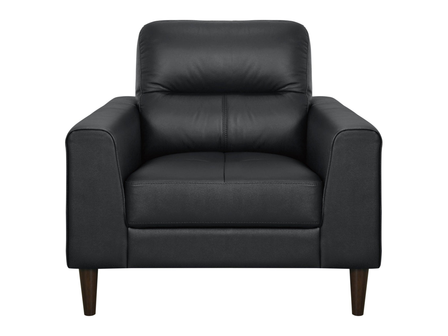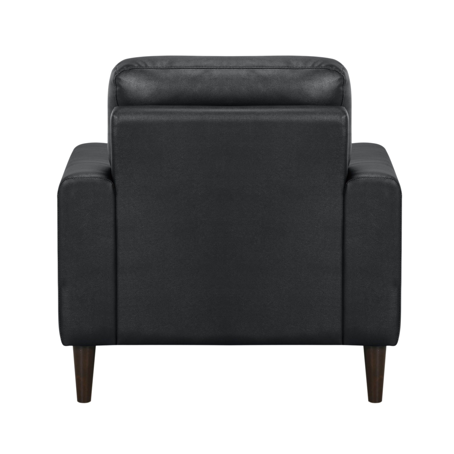 Modern comfort is paired with retro lines to create the design of the Lewes Collection. Covering the chair is black 100% top grain leather where the body touches, while all other areas feature faux leather. Track arms and contoured seating lend to the versatile modern look. Supporting the chair are solid wood legs with a brown finish.