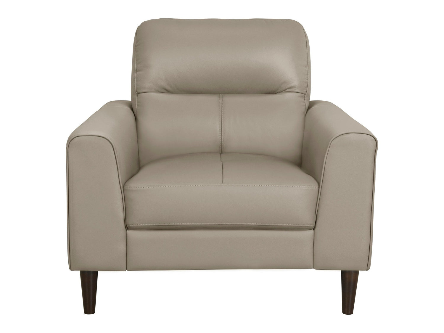 Modern comfort is paired with retro lines to create the design of the Lewes Collection. Covering the chair is Latte-hued 100% top grain leather where the body touches, while all other areas feature faux leather. Track arms and contoured seating lend to the versatile modern look. Supporting the chair are solid wood legs with a brown finish.