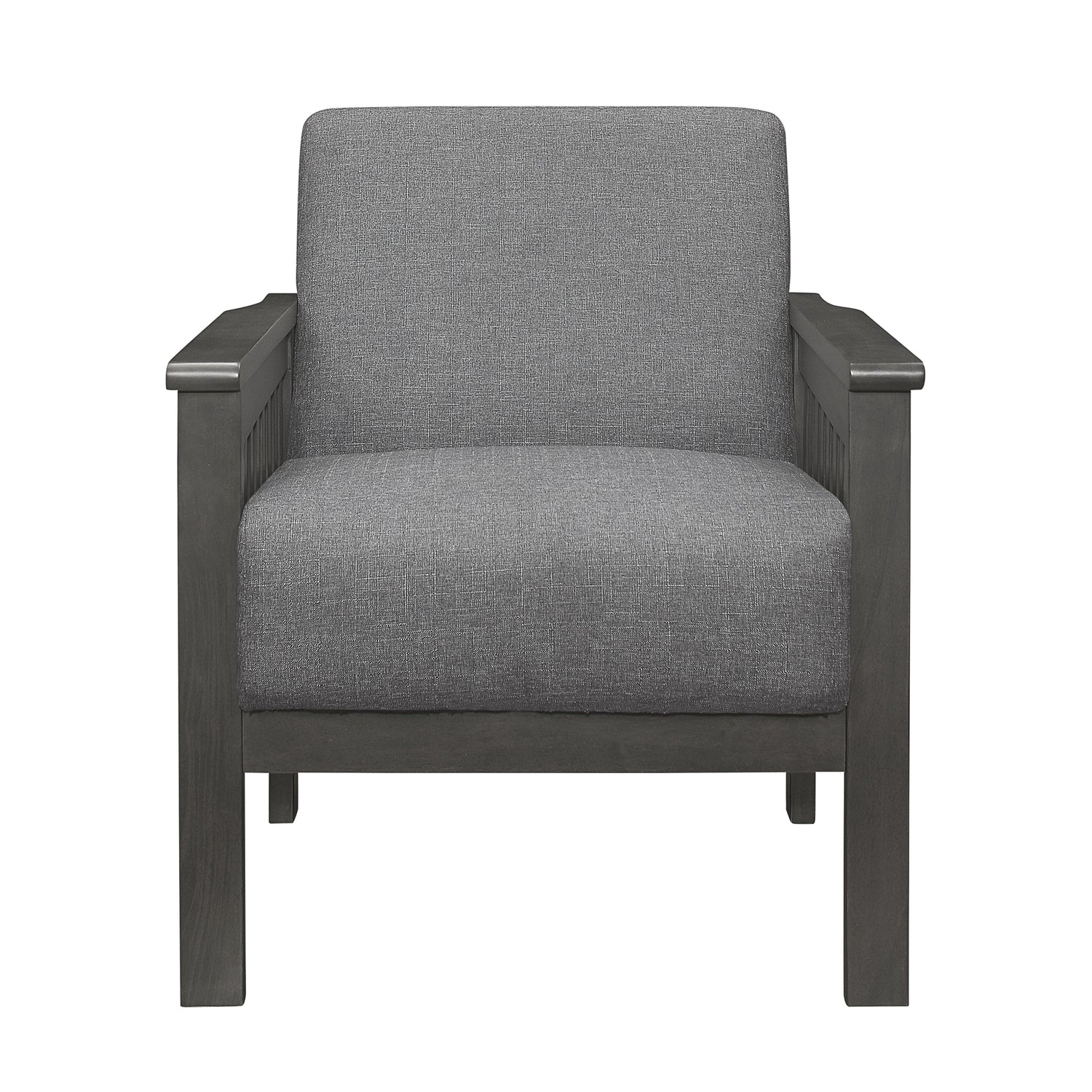 Designed with inspiration from the Arts & Crafts movement, the Lewiston Collection will be a classic addition to your home’s décor. The chair's transitionally styled legs and vertical slat-supported wood arms are finished in an antique gray, providing complementing contrast to the gray linen-like fabric covering.