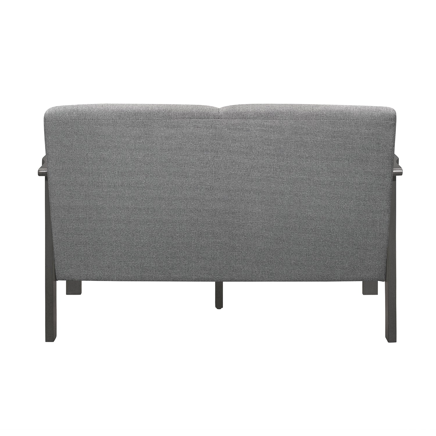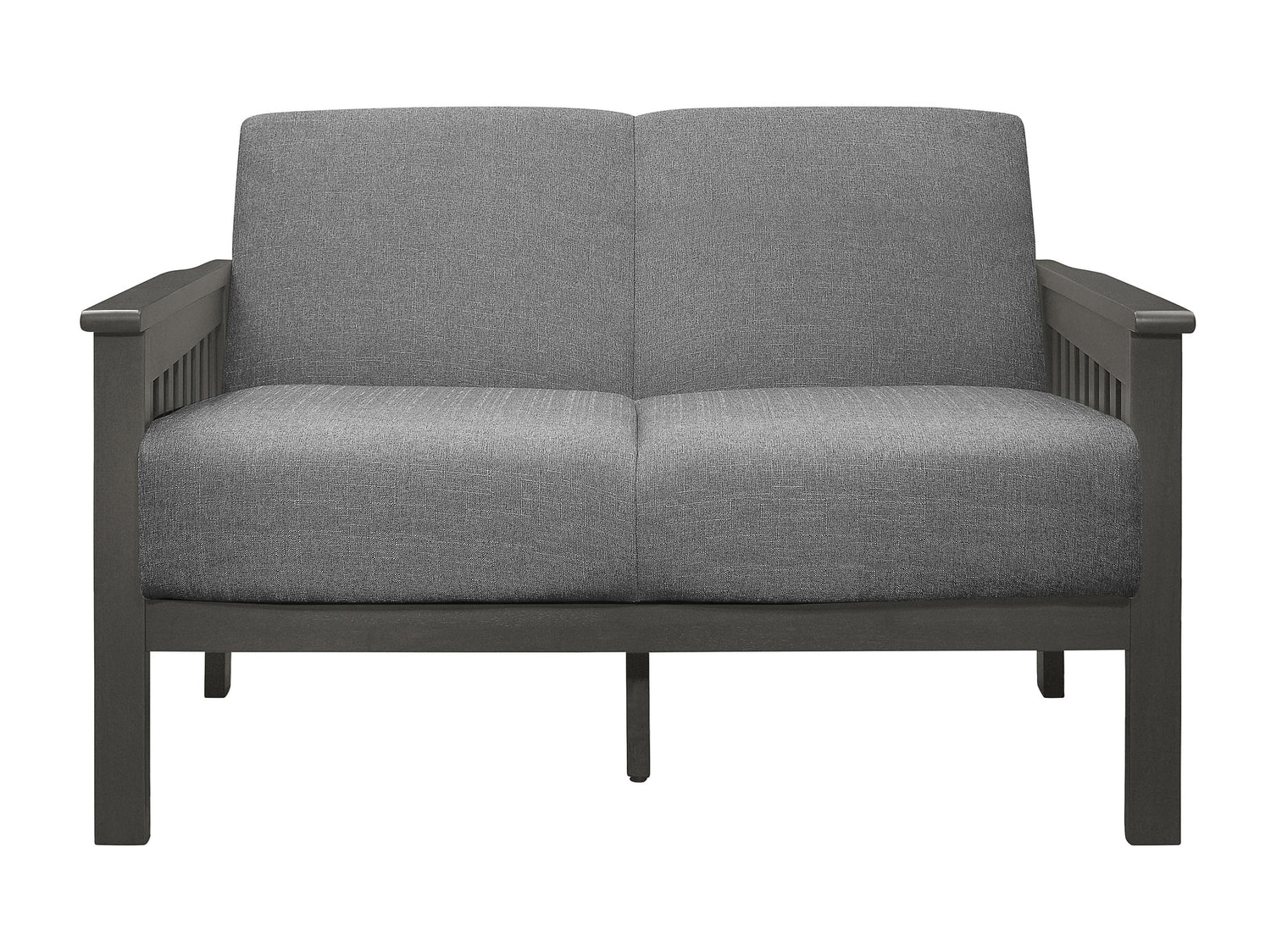 Designed with inspiration from the Arts & Crafts movement, the Lewiston Collection will be a classic addition to your home’s décor. The love seat's transitionally styled legs and vertical slat-supported wood arms are finished in an antique gray, providing complementing contrast to the gray linen-like fabric covering.