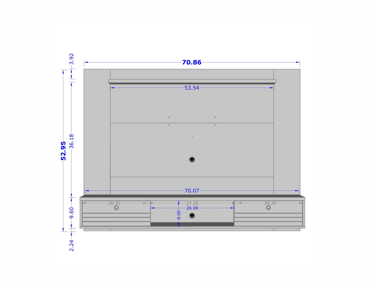 - Upon assembly, Floating Entertainment Center Dimensions Measure: 70.86 in. Length, 52.95 in. Height, 12.99 in. Depth.