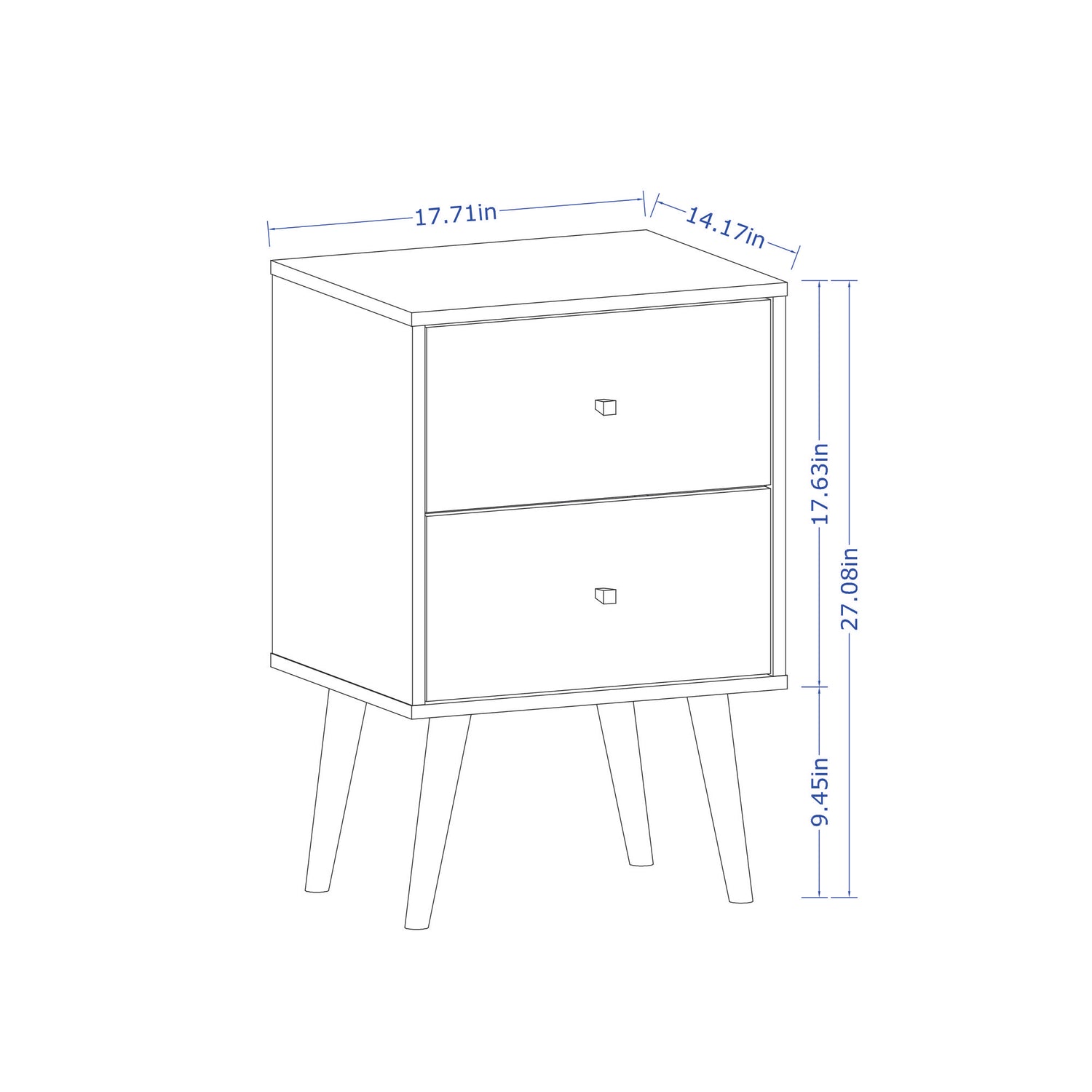 - Upon assembly, Nightstand Dimensions Measure: 17.72 in. Length, 27.09 in. Height, 14.7 in. Depth.