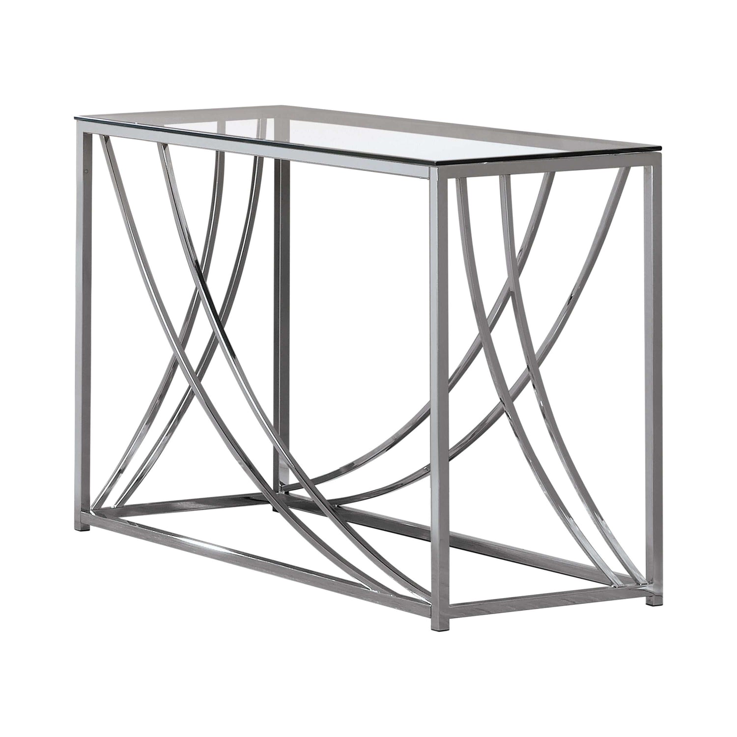Full of clean lines and swooping curves, this modern sofa table adds depth to any living room or entryway. Bright and radiant, a shiny chrome finish dresses up the simple lines of the frame. The contemporary design of the decorative accents sets the smooth silhouette apart from the rest. Revel in the luxury and structure of the combination of a metallic base topped with glass. Create a visual focal point with the textures from this charming table.