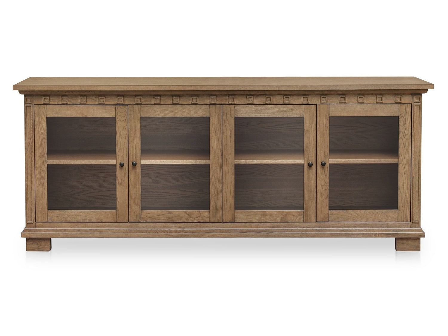 The Lillian Brown Sideboard is a storage cabinet constructed from solid ash and ash veneer that organizes your home essentials. This piece puts a fresh face on tradition, offering display and storage. Crafted with a rich wood grain and warm mid-tone finish, it combines crisp lines with classic molding details. Four glass-front doors allow dinnerware, vintage finds, or everyday items to be seen, with blackened bronze handles providing a useful contrast.