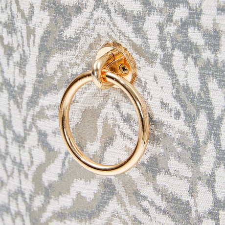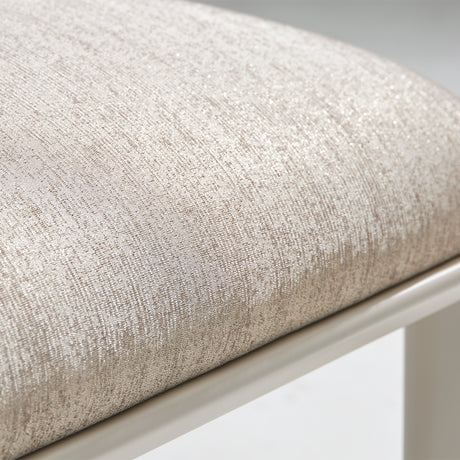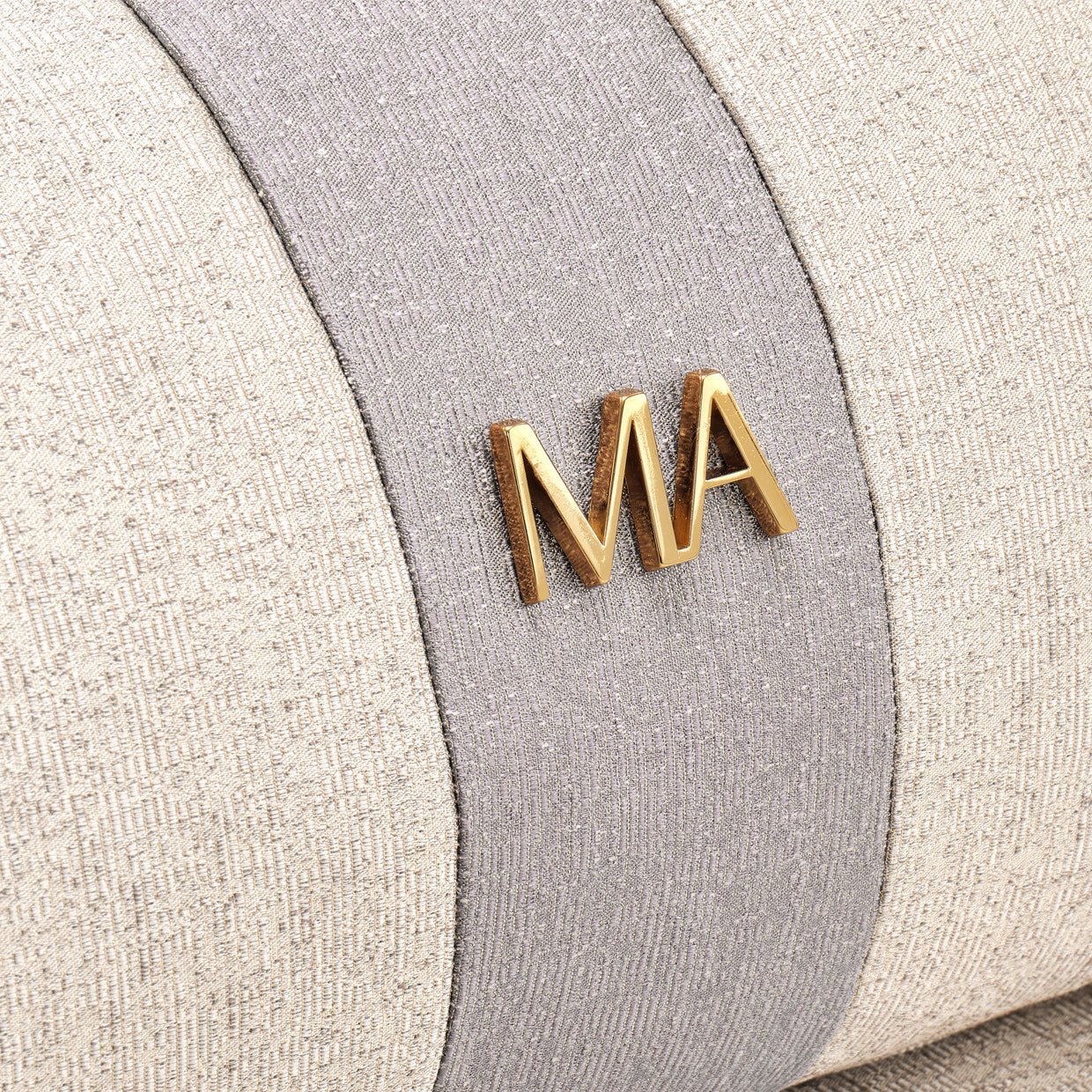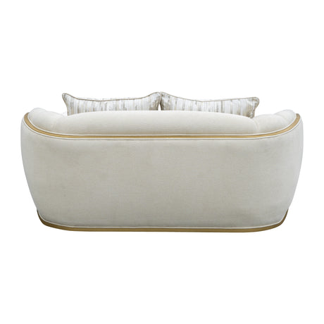 The intimate curves of this loveseat will hug you while seated. The light silvery beige fabric with lurex woven in, along with the sleek brass legs lend to the updated modern transitional style. The accent pillows are fashioned with complimenting patterns and fabrics with some of the pillows featuring metal details and hardware showcasing a chic, stylish design.