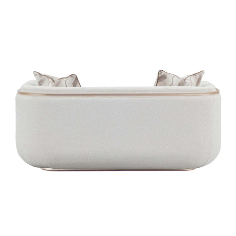 - A gold plated metal leg attachment surrounds the loveseats gentle curves
