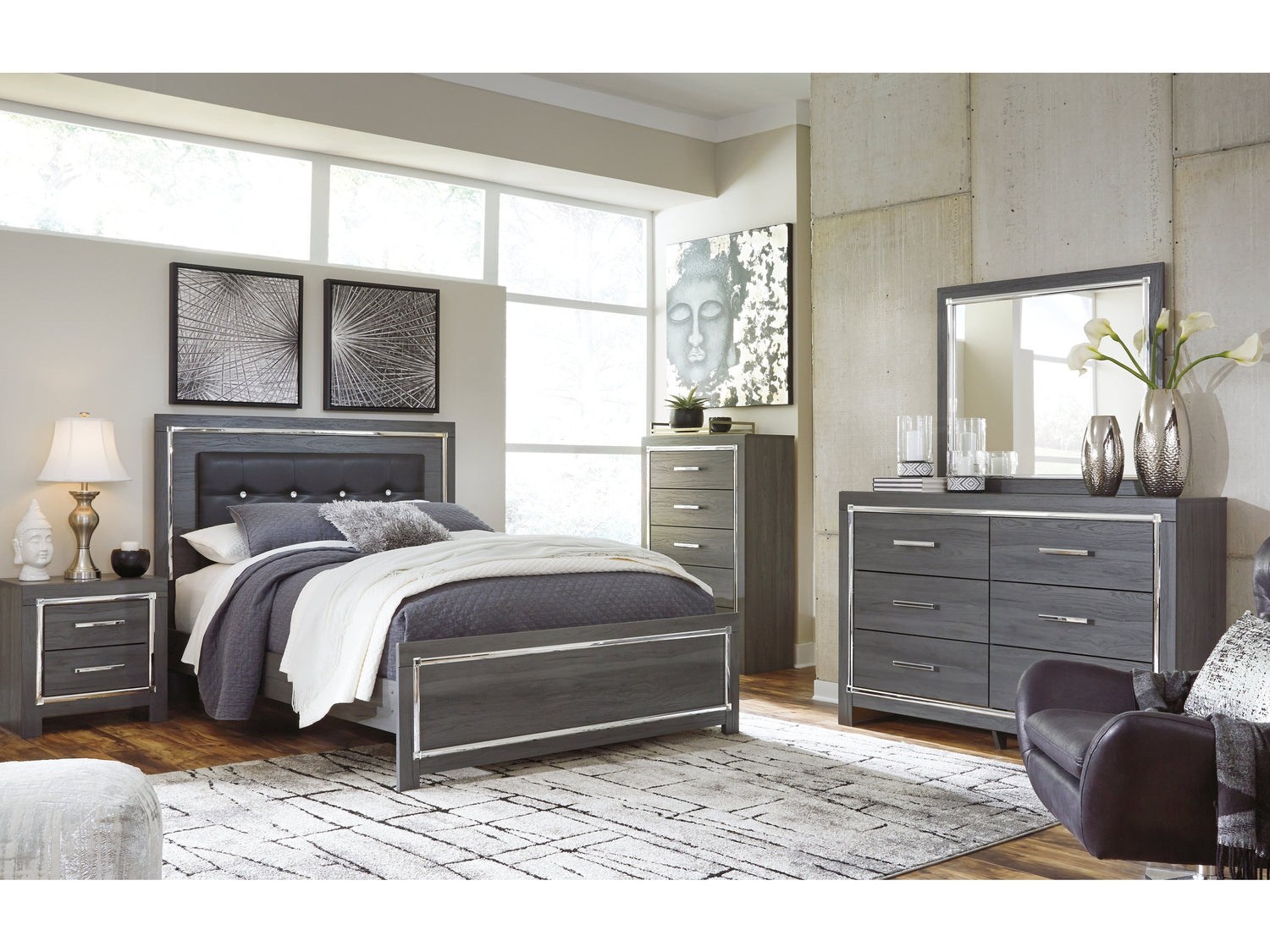 - Item Name: Lodanna Gray Queen Upholstered Panel Bed, Dresser, Mirror and 2 Nightstands