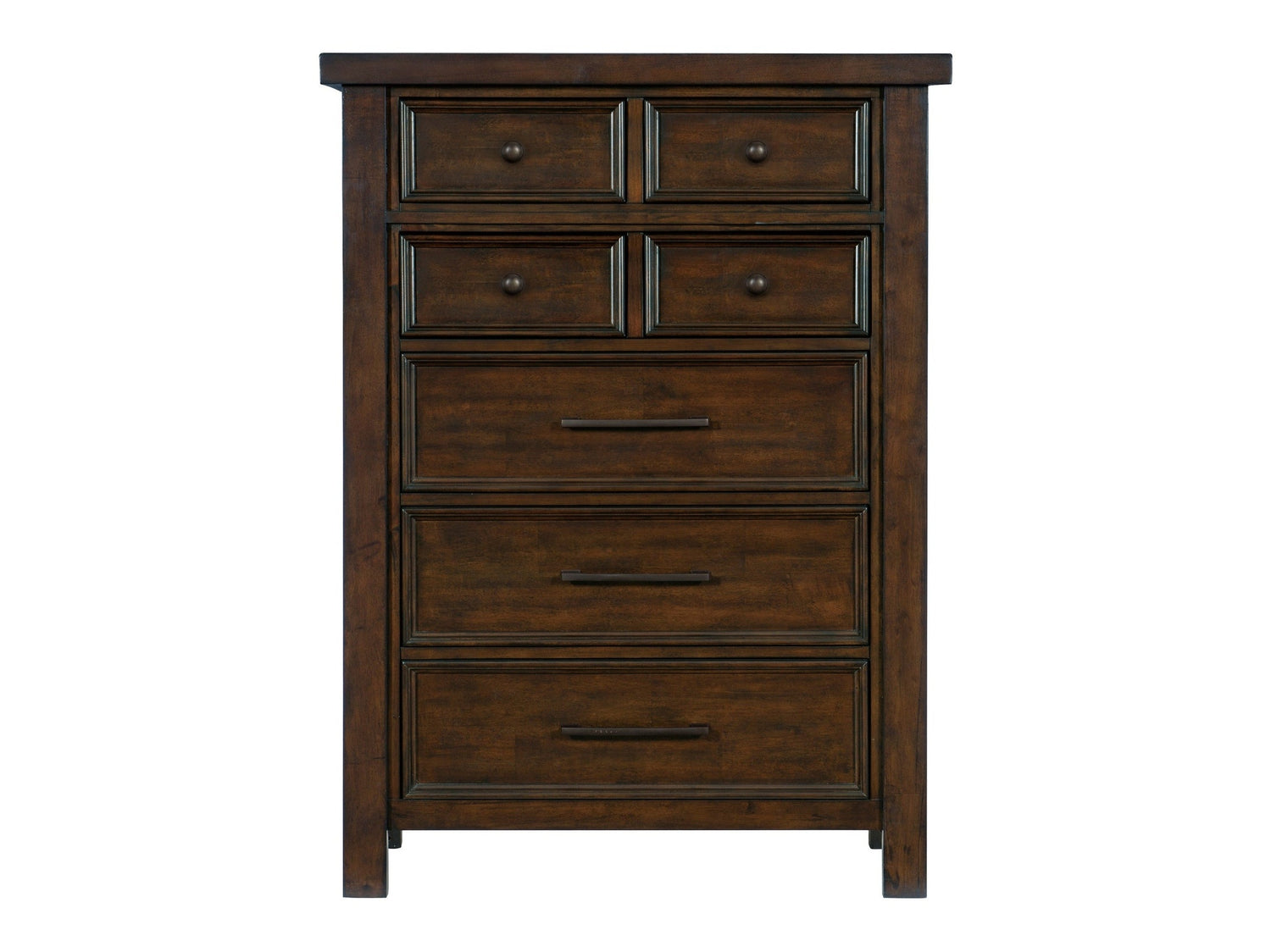 The transitional framing of the Logandale Collection allows for versatile placement within a number of classic bedroom decors, making a perfect choice for your home. A brown finish is utilized over mango veneer for subtle highlighting of its distinct grain. Dark finished metal knob and pull hardware front each drawer of the chest, creating a complementing accent to the collection.