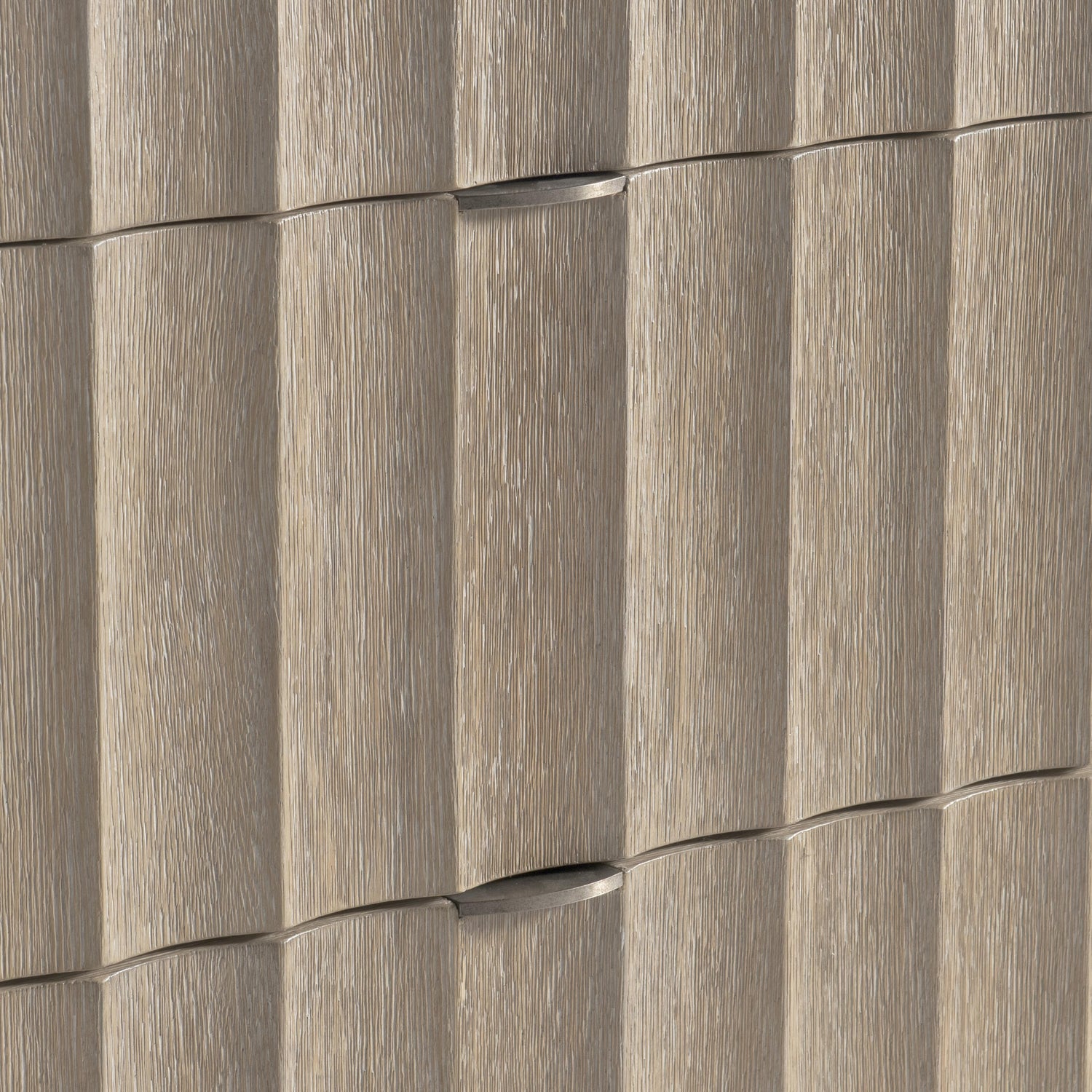 - Six scalloped-front drawers with stainless steel tab pulls in Laurion finish
