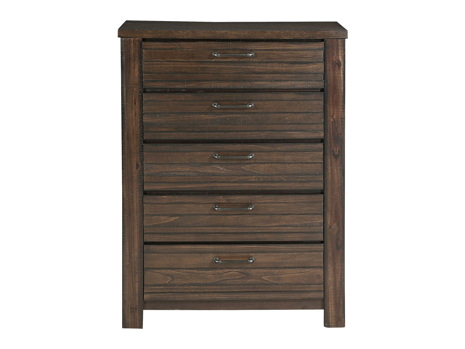 Rustic styling combined with hints of industrial practicality create the Longview Collection’s straightforward look making for a perfect addition to your bedroom. A dark brown finish is utilized over birch veneer, highlighting the wood’s grain. The planked framing gives the chest a rusticated aesthetic while the metal bar hardware lends an industrial touch.