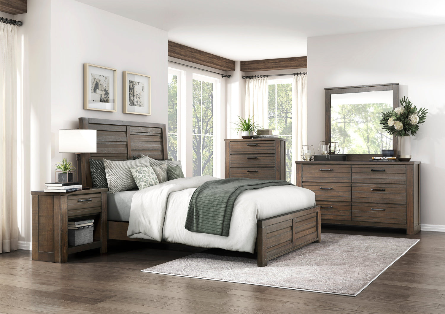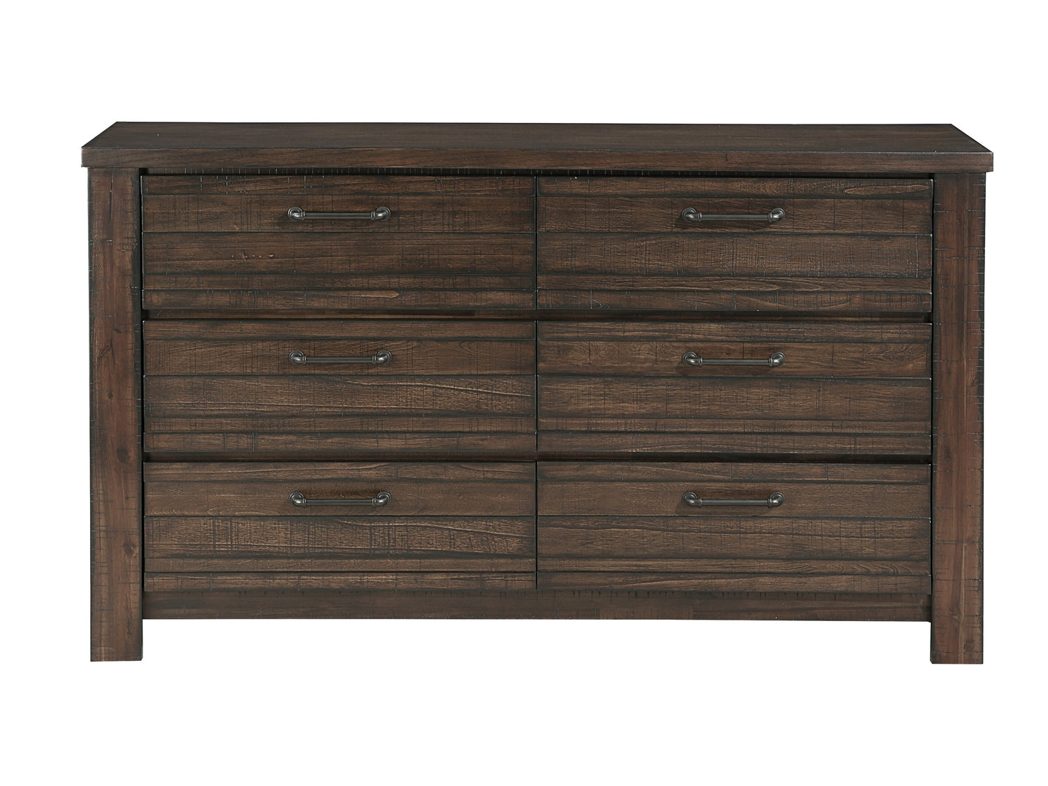 Rustic styling combined with hints of industrial practicality create the Longview Collection’s straightforward look making for a perfect addition to your bedroom. A dark brown finish is utilized over birch veneer, highlighting the wood’s grain. The planked framing gives the dresser a rusticated aesthetic while the metal bar hardware lends an industrial touch.