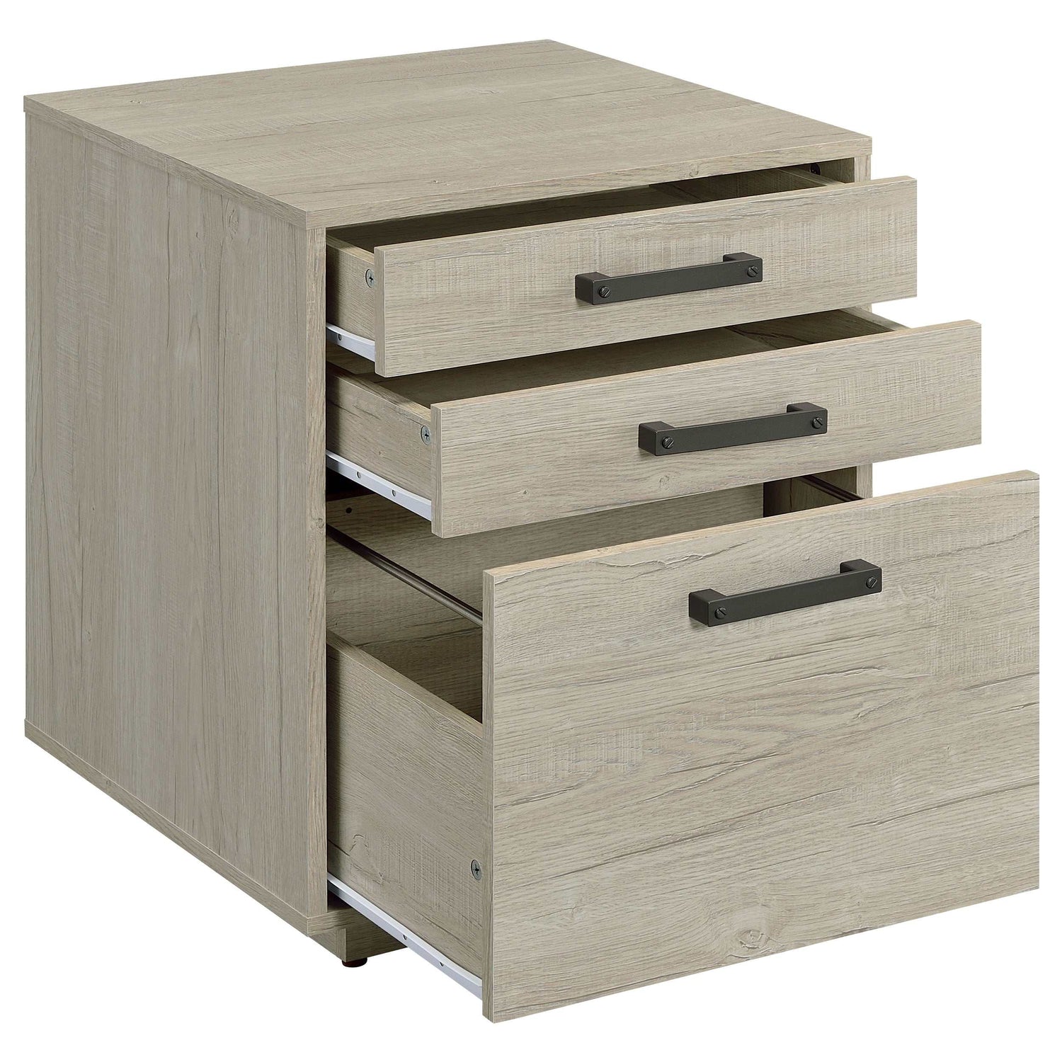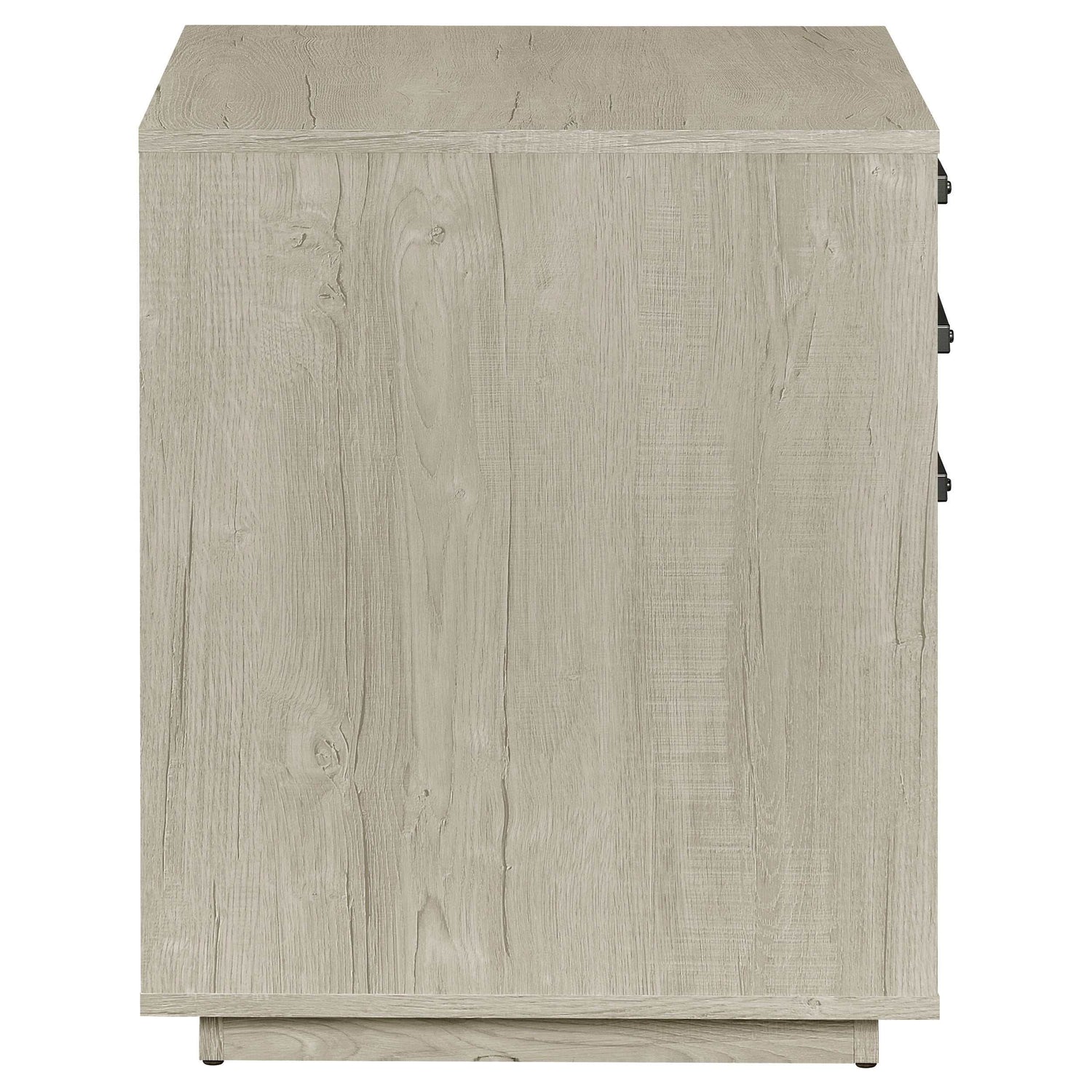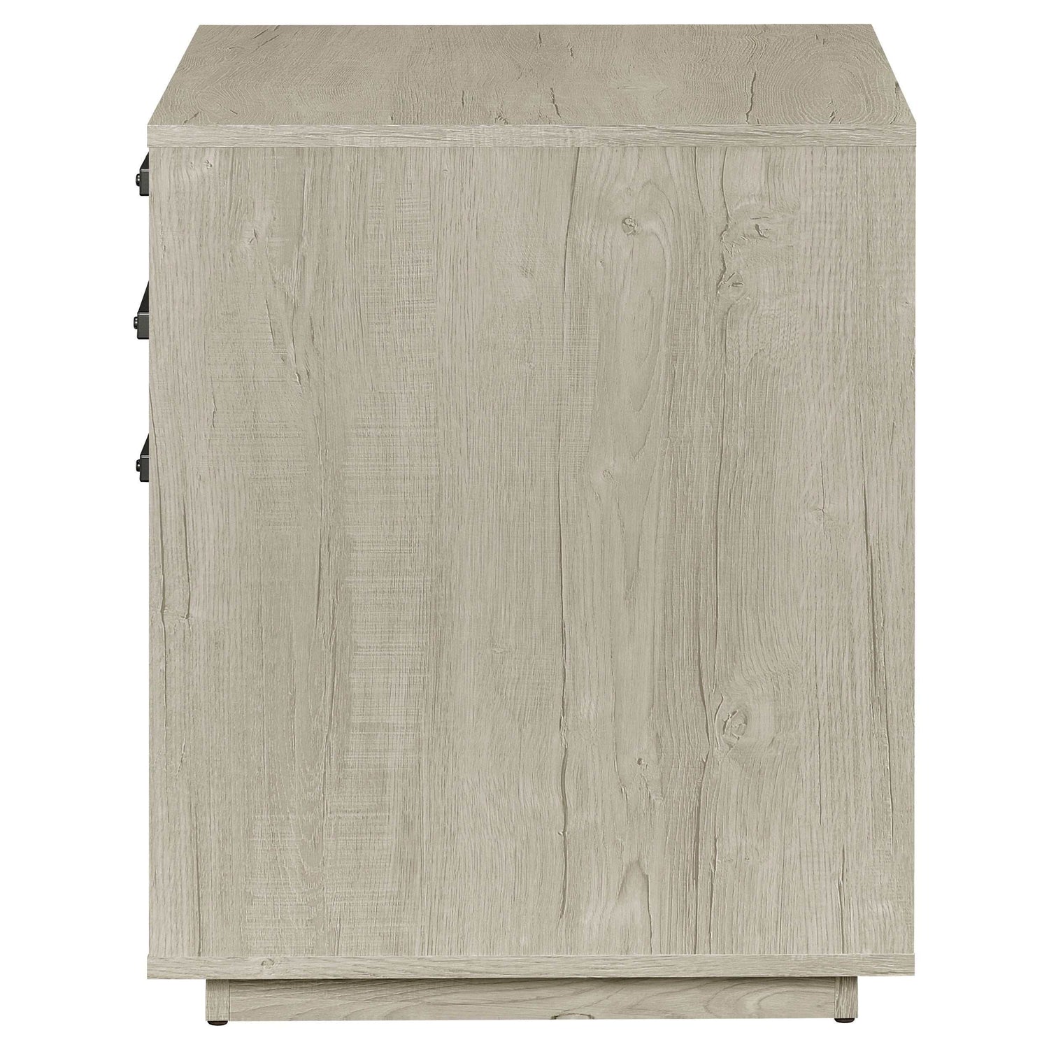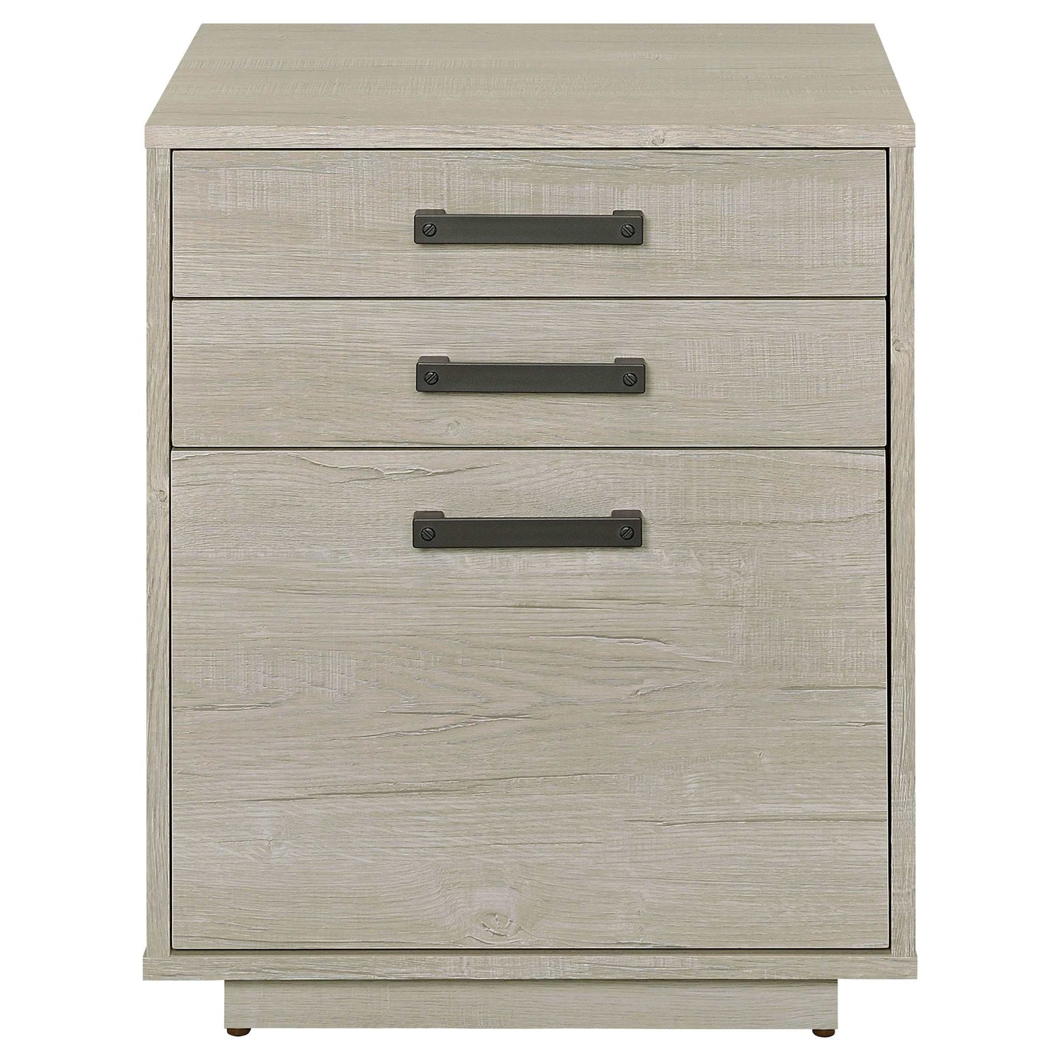 Free up desk space with this contemporary file cabinet, featuring a lovely whitewashed grey finish across its boxy frame and three drawers. Along each drawer is a slim gunmetal finished pull that presents an industrial modern flair to a transitional home office.