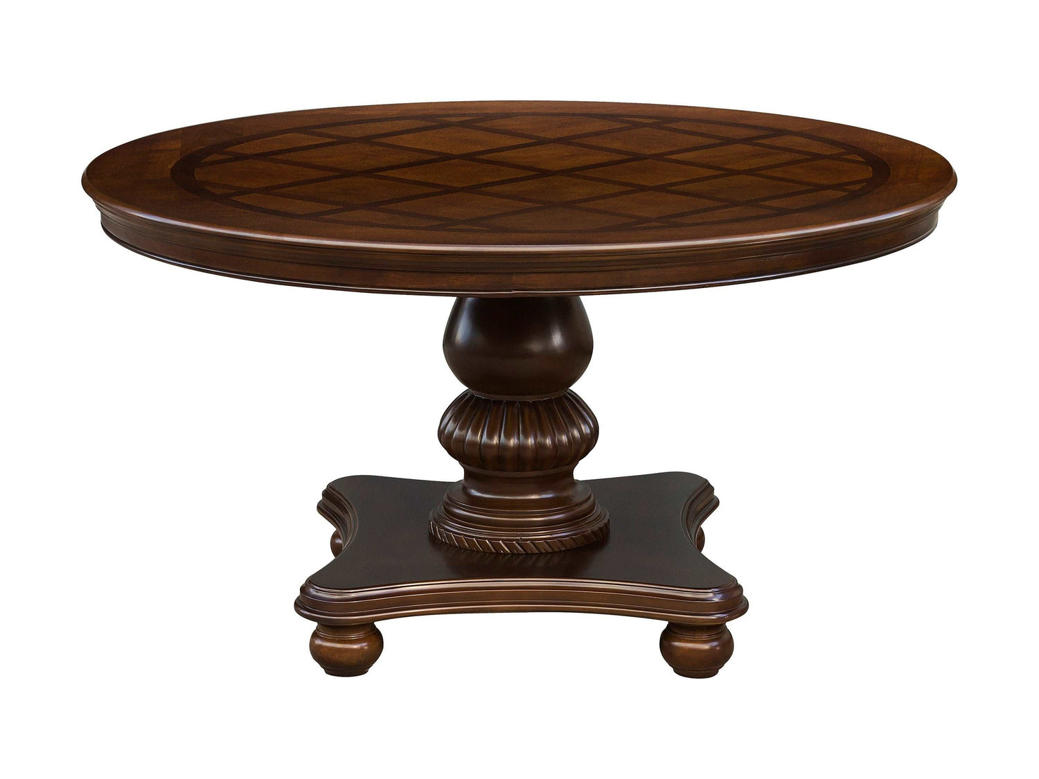 Elegantly designed for the traditional dining room is the Lordsburg Collection. Supported by the pedestal base is the table’sround top where the magnificent parquet veneer is highlighted by the brown cherry finish. Heavily carved molding provides a distinct accent to the table’s top.