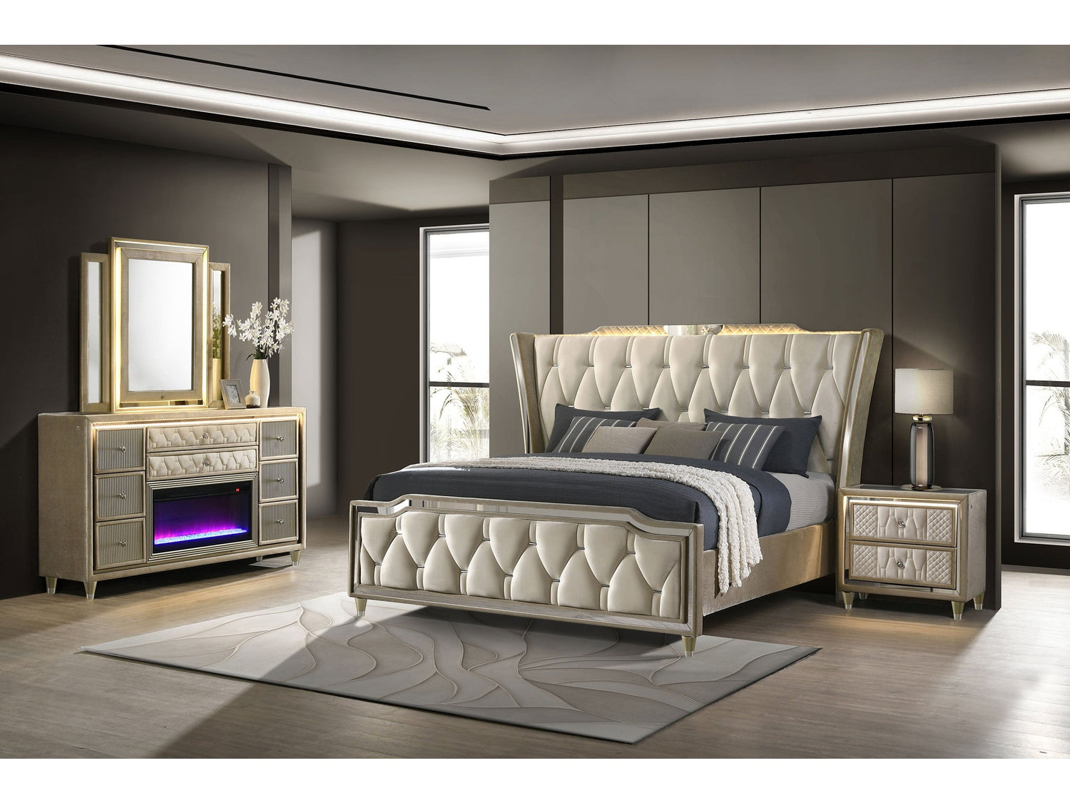 - Includes: One (1) queen bed, one (1) nightstand, one (1) fireplace dresser, and one (1) dresser mirror