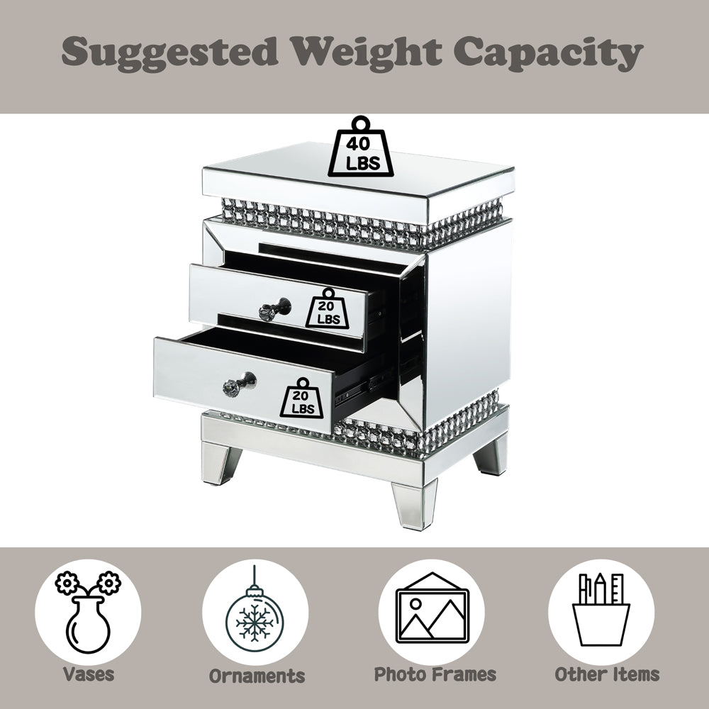 Shining in the Hollywood glamour style, the Lotus Accent Table will be an ultimate statement piece for your dreamy living room. This mirrored furniture features reflective surface for a multi-layered look, with decorative faux crystals enhancing its modern and glamorous design. It offers two felt lined drawers with safety stop and self closure for your precious belongings. This fabulously glam accent table reflects your sense of style, adding depth and shine to your living space.