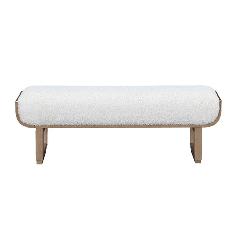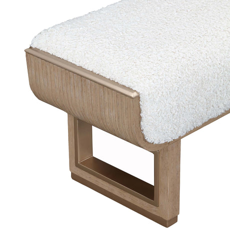 The Lotus Bay Accent Bench embodies understated glamour, bringing a refined finishing touch to any room. Its sleek, modern silhouette is anchored by sand-hued legs in the graceful look of white oak, each accented with marbleized inlays that shimmer with quiet sophistication. The seat, upholstered in a softly textured woven fabric of natural tones, offers both comfort and timeless elegance. Versatile in design, this bench lends itself beautifully to the foot of a bed, a chic entryway, or as a statement accent in living spaces—wherever it rests, it elevates the ambiance with serene luxury.