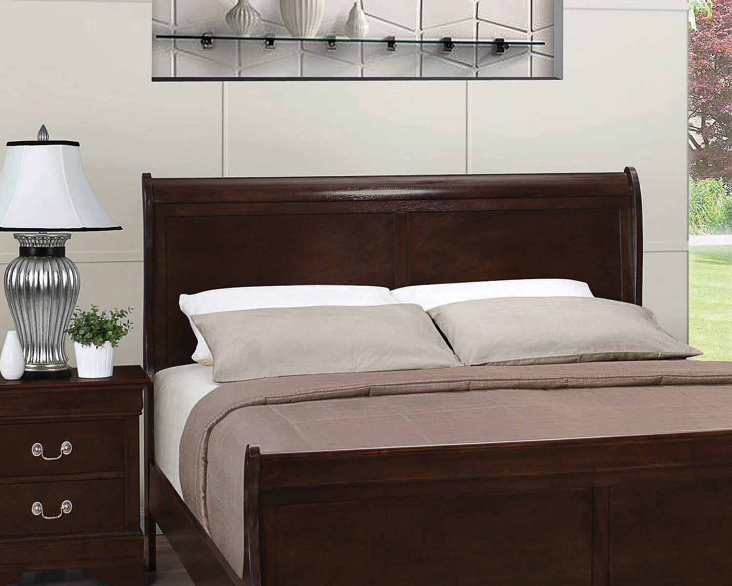 - A slightly higher headboard distinguishes this classic Louis Philippe style bed