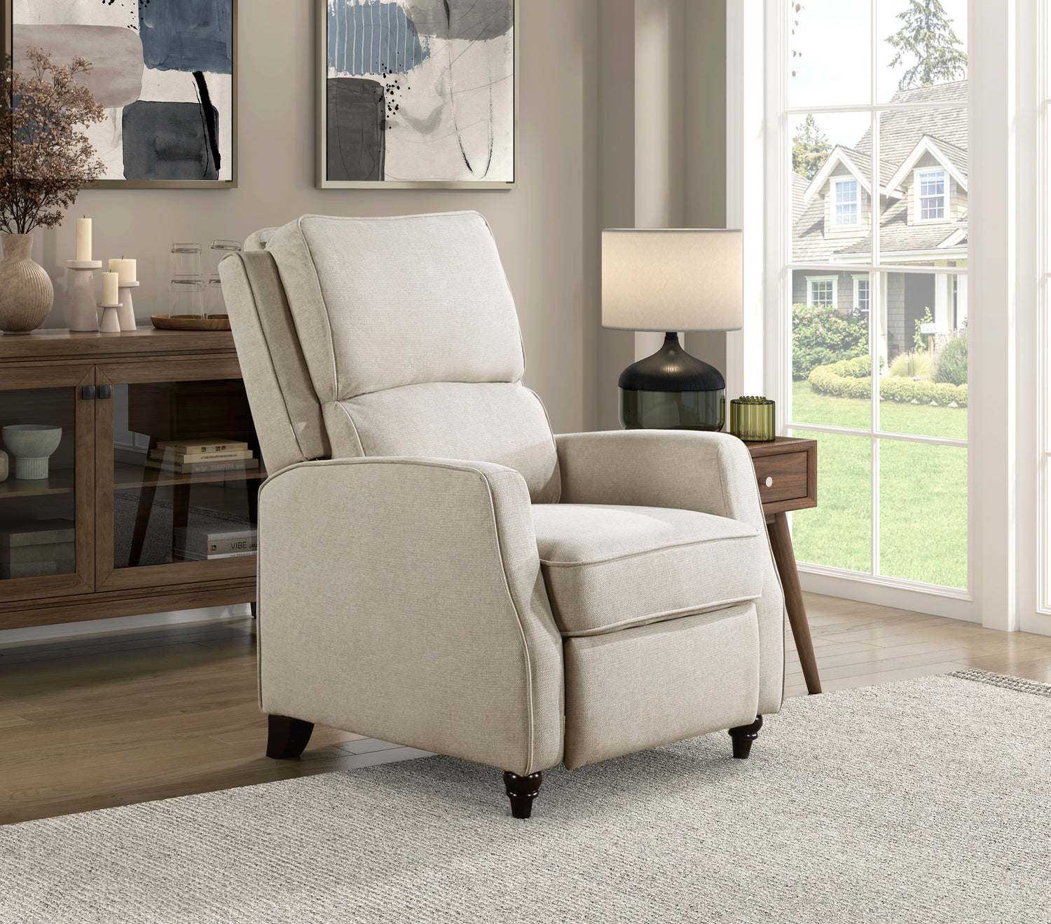 With a transitional style that complements myriad home aesthetics, the Loveland Collection provides comfort and function for your personal space. The recliner eases into the prone position with motion that is initiated by your push. Textured fabric upholstery covers the push back recliner, its beige hue providing neutral complement to your home’s existing décor. Support for the chair comes in the form of the dark brown finished turned wood legs.
