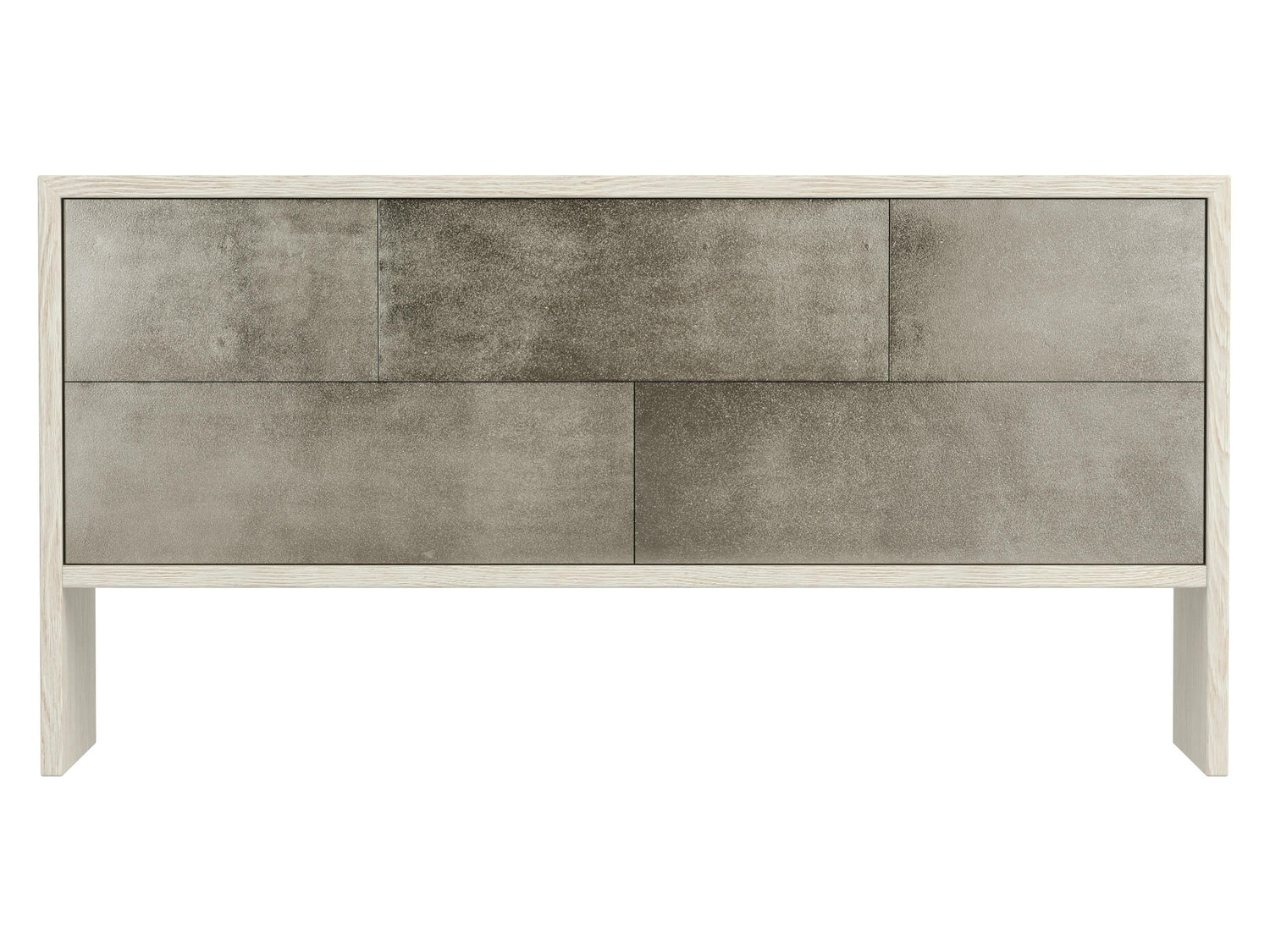 - Five push-to-open drawers with inset front panels of Cast Aluminum in SHINY NICKEL finish. Bernhardt name plate on top left drawer.