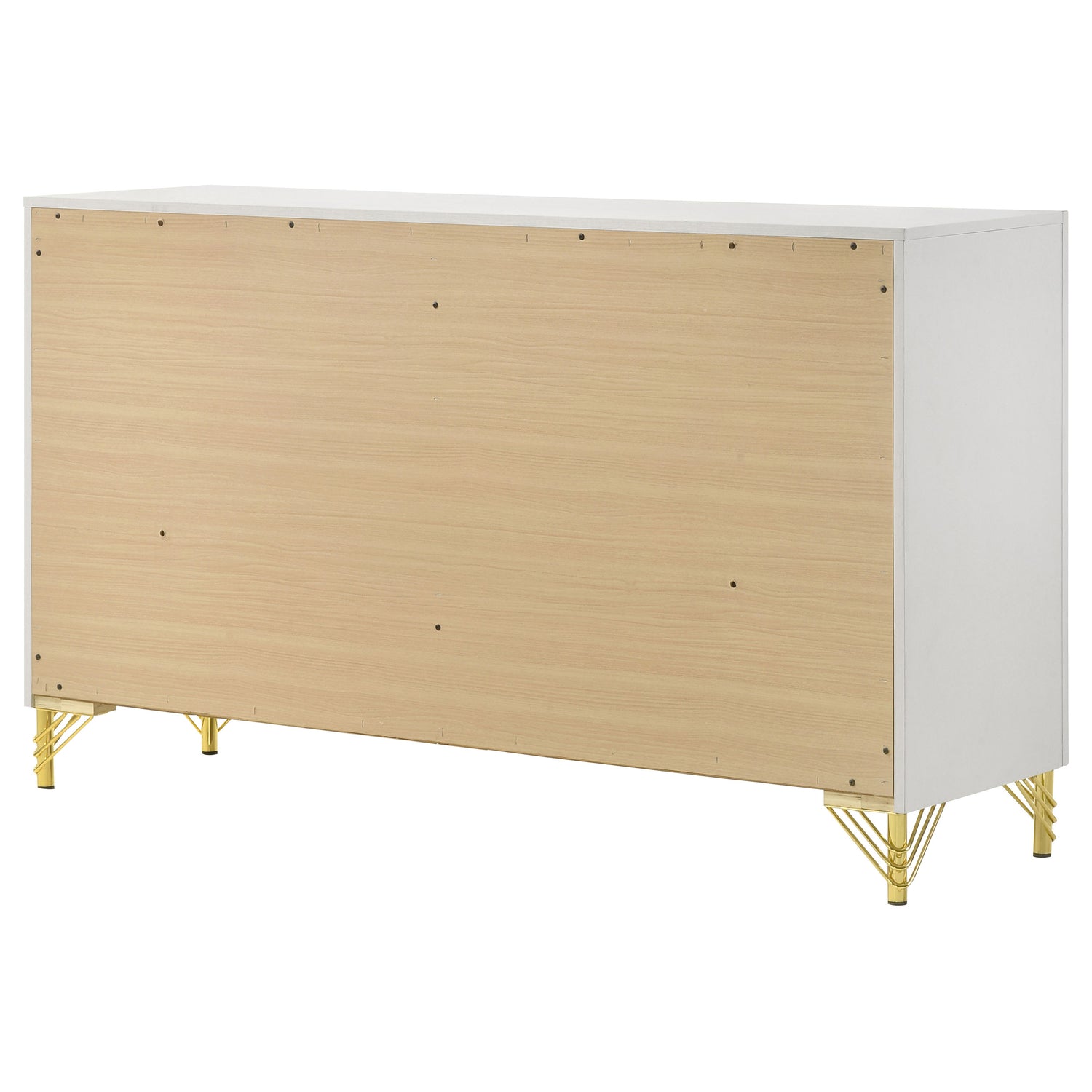Accentuate surrounding decor with the sophistication of a modern six-drawer dresser. Designed for ample storage, it features a refined look with spacious drawers ideal for everything from clothing to accessories and linens. Its bright white finish is crisp and chic, complemented perfectly with rich, warm gold trim that gleams in the light. Decorative legs have hairpin inspired style, offering a stylish touch of vintage energy. Long bar pulls complete the look with polished perfection.