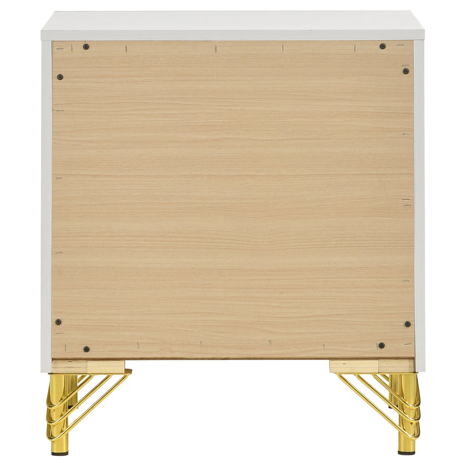 Gleaming gold trim captures attention on a modern two-drawer nightstand. Perfect for your sophisticated bedside, it boasts a bright white finish case that offers the perfect touch of depth with its gold trim. A pair of long bar pulls decorate drawer fronts. Hairpin style legs offer vintage flair and exceptional elegance. Two drawers add plentiful bedside storage, offering a place to ruck away personal items and overnight essentials.