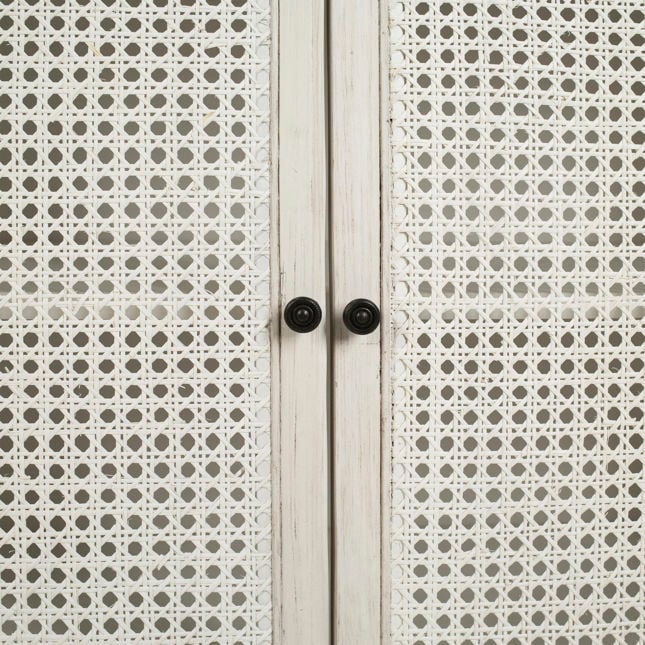 Perfectly designed to refresh your decor with modern, coastal flair. This 66' sideboard is made of acacia wood in an antique whitewash finish with rattan details in each door panel. Featuring three cabinet doors that open to four interior shelves that can accommodate dinnerware, electronics, or office supplies.
