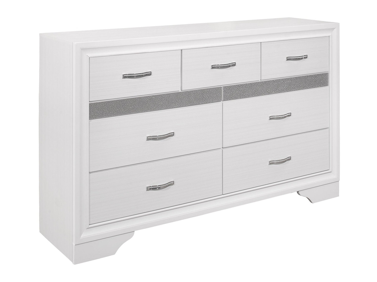 The unique styling of the Luster Collection presents a glamorous option for your bedroom. The dresser’s embossed faux-wood veneer features a white finish that allows for the acrylic silver glitter front of the hidden jewelry drawer to shine. The jewelry drawer features felt lining to protect your hidden items from wear and tear. Polished chrome bar drawer pulls front the drawers providing complementing contrast to the collection’s finish.